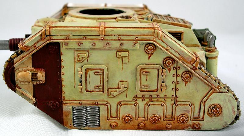 That rust is done by painting the area with Tin Bitz then probably some Dwarf Bronze, then a Thrakka Green wash or two in the recesses.