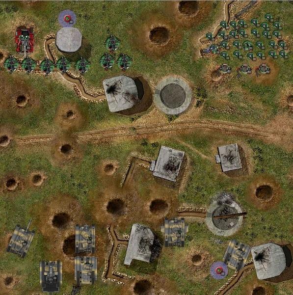 IG fail to seize. The Deffkoptas are place-holders for the Grot Tanks, and the Looted Wagon is the Grot Mega-tank. The Orks hold the Grots in reserve. The Orks plan on flanking the enemy's objective with the Boyz and Kans, and putting as many wrecked tanks between the Russes and their own as they can. The Guard intend to break through the Grot Tanks, take the objective, then contest the remaining one with Leman Russes.