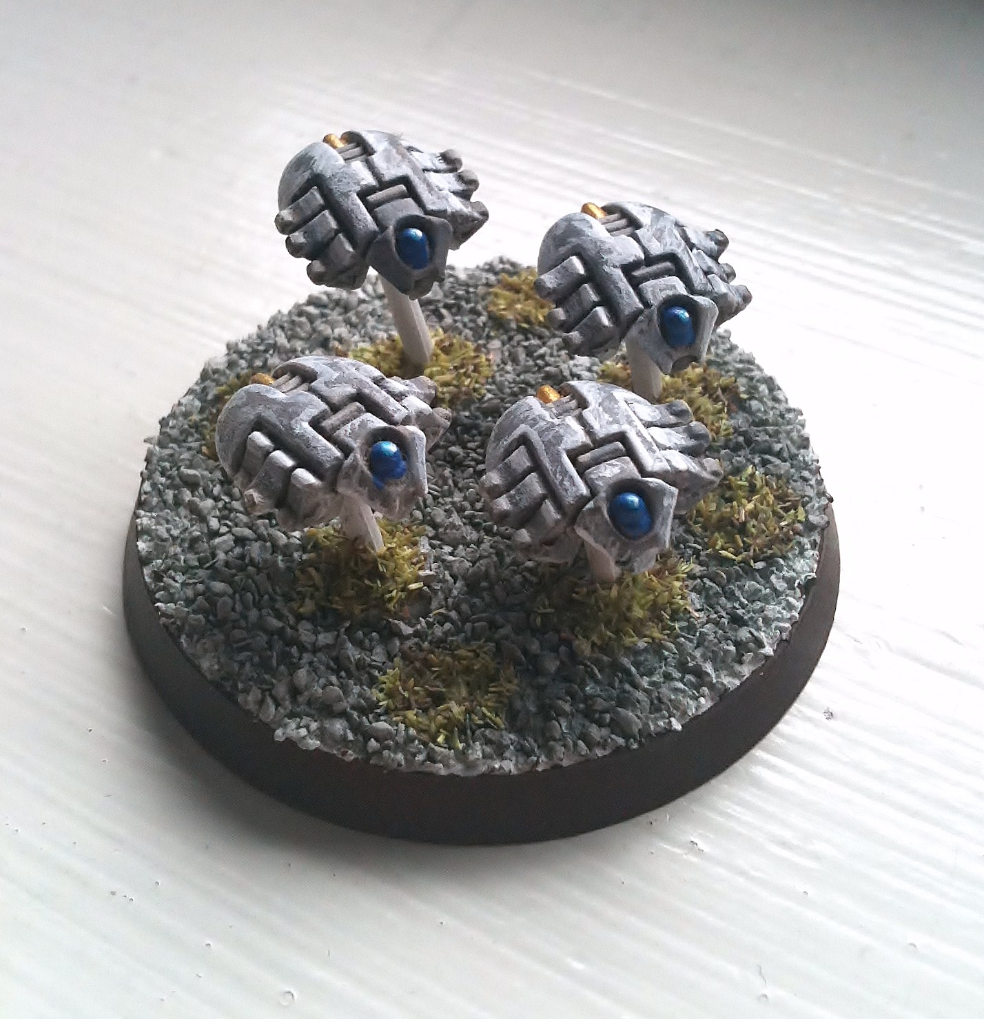 You can buy blue rods from Plastruct to replace the green rods, which will give you a great thematic look to them. I like the base, but a gem-like highlighting on the eyes would add a lot of character to them. It also looks like you may have jumped a few too many shades on the highlighting, as it looks a bit dusty.