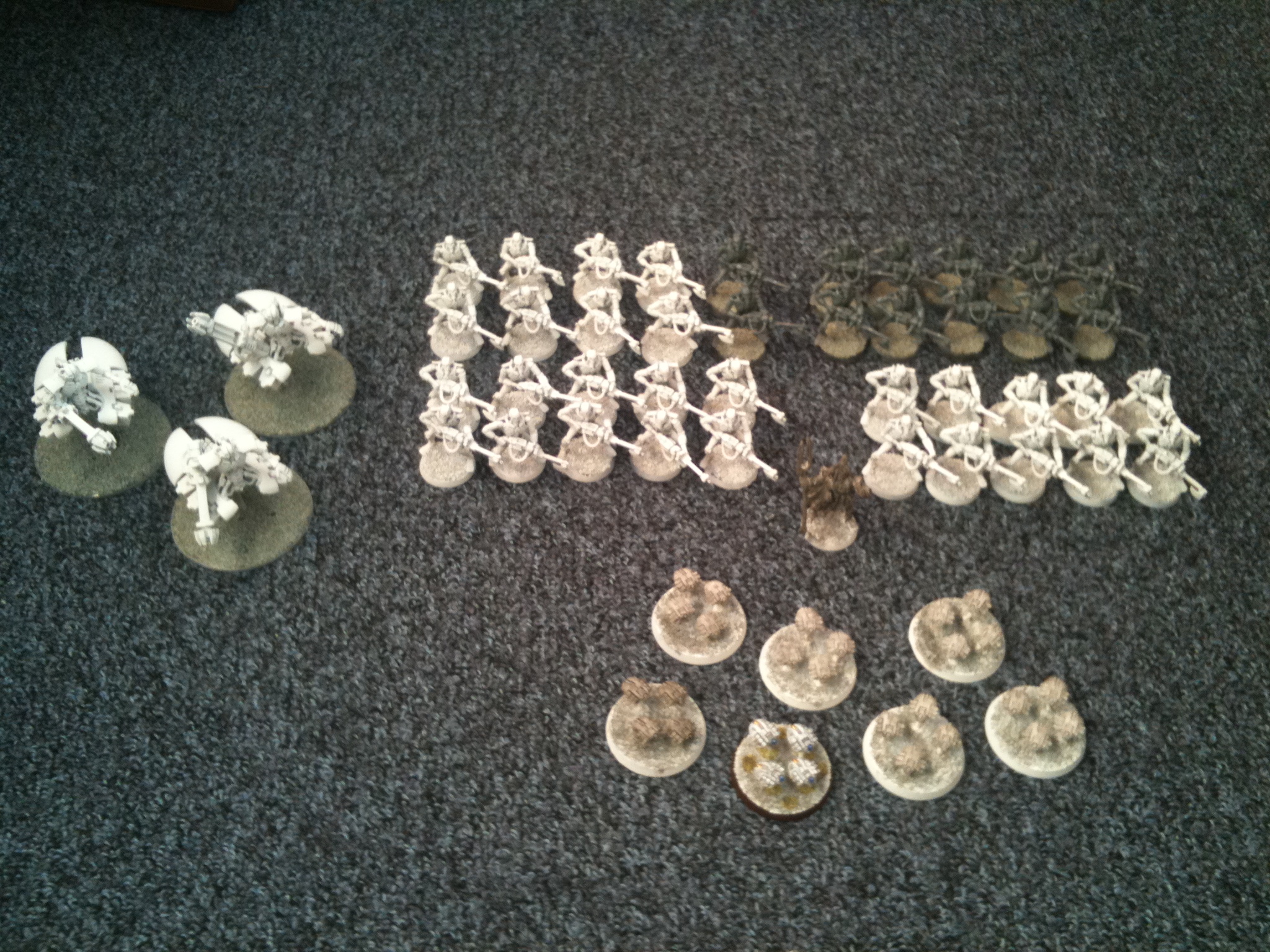 Gah!. I'm bad at this. I meant to post a few days ago, but got thouroughly distracted by my job. What's worse, the offering that i bring to you is meagre at bast. I haven't actually painted any new miniatures yet, but have finally recieved all of my stuff through the post, assembled it and (mostly) undercoated it. Below are some pictures of the army so far (minus 3 scarabs). A lot of it has been purcahsed on eBay, and so is either reconditioned (paintstripped) or brand new but previously owned.