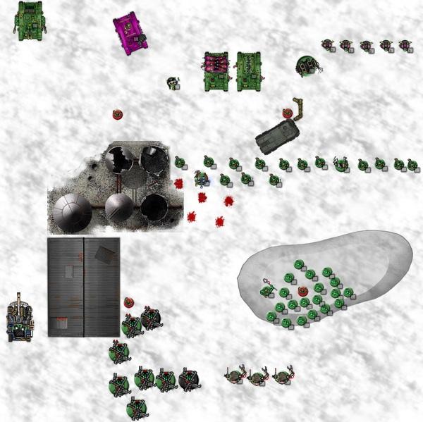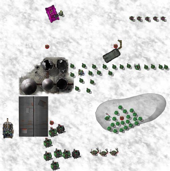 Ugh, Seize Ground with 4 objectives in a Dawn of War deployment, and the Orks are going first. Nikolii fails to seize, and the Possessed roll Fleet. His plan is to sit back and outshoot the Orks. Failing that, contest the Ork's corner. The Grotzkrieg intends to use the Boyz to buy time for the Grot Tanks to contest both objectives.