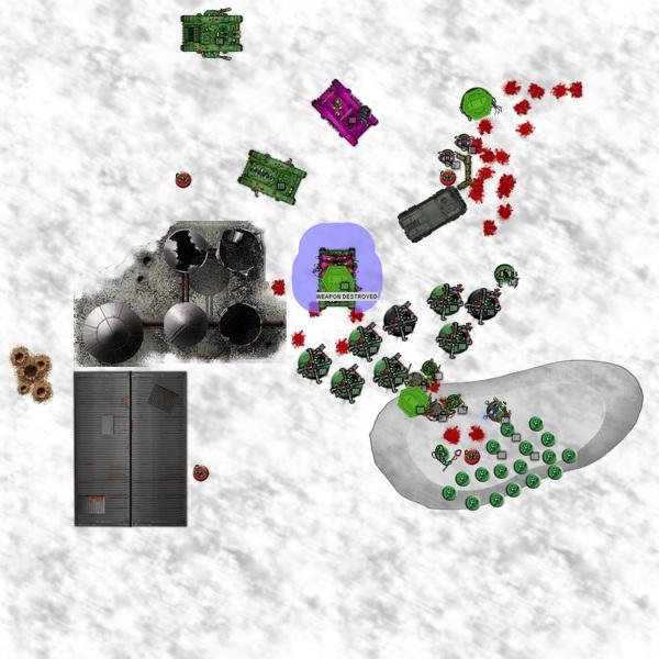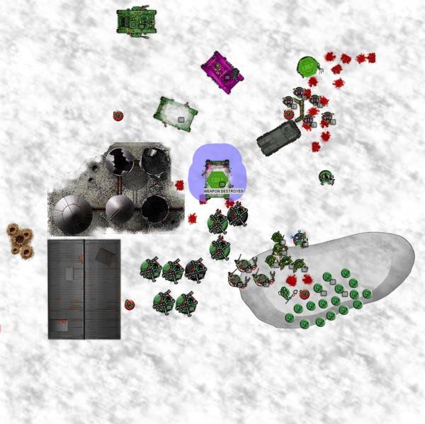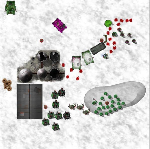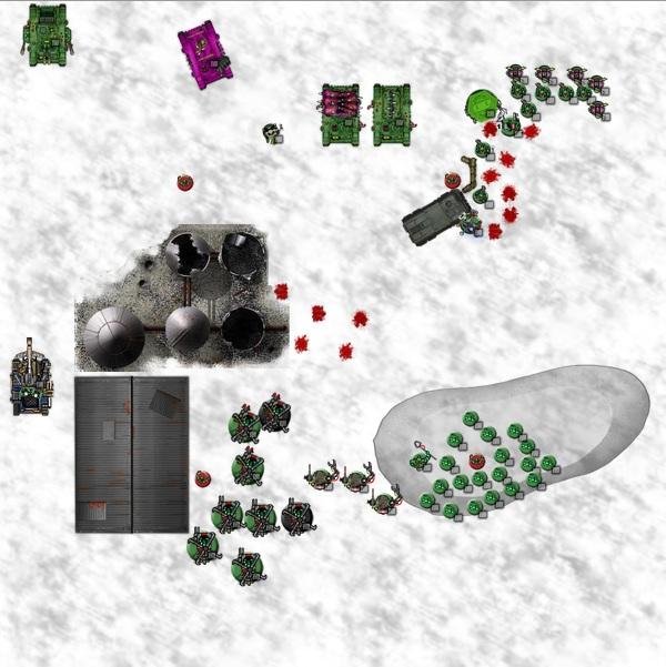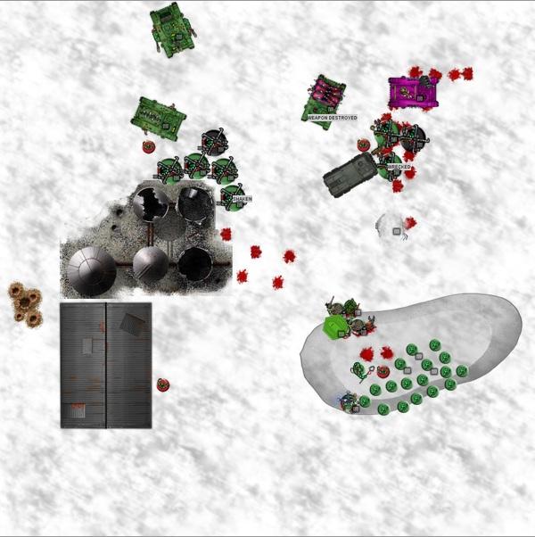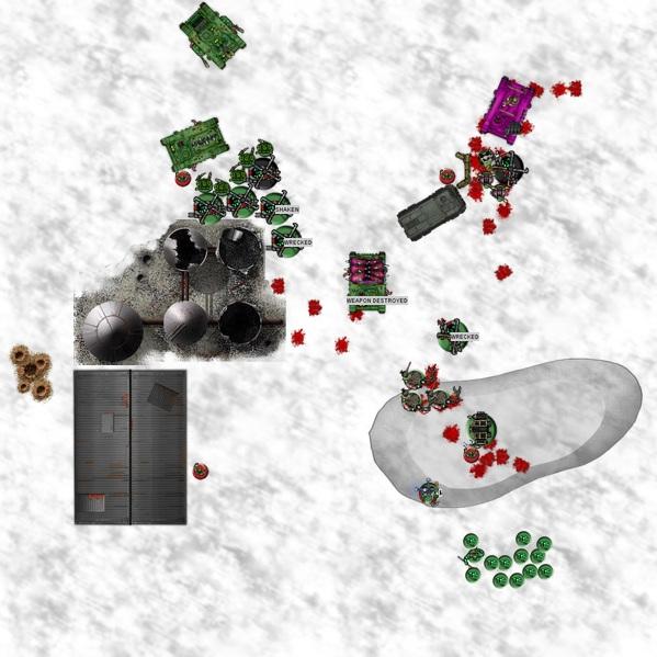 Nikolii and company do their best to rid the objectives of the Orkish presence, but to no avail. The Dreadnought manages to get in range and routes the Grots, but with both objectives contested by the tanks it matters little. The final Possessed is slain, and the game ends with a roll of 2.