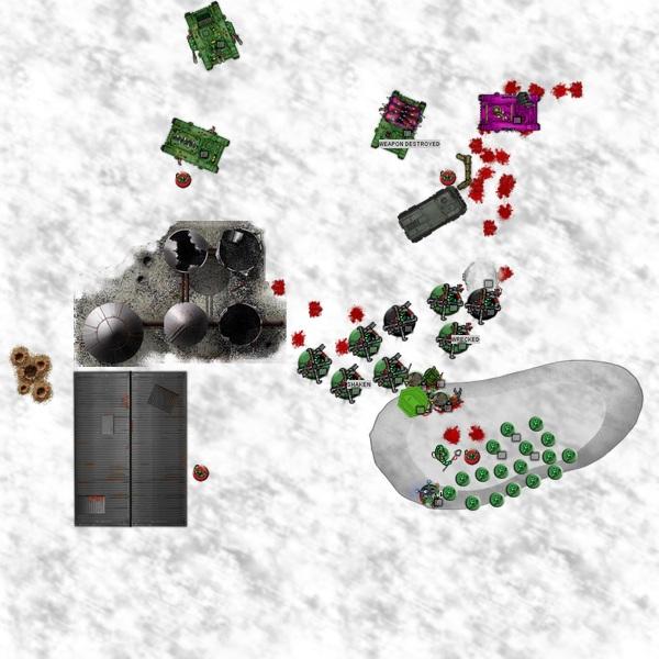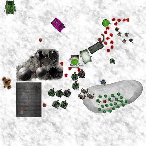 The hallowed Predator explodes the Grot Mega-tank, the Orks are routed, and the Rhinos advance. By the way, Nikolii hopped in with the Possessed, who are in the really screwed up Rhino.