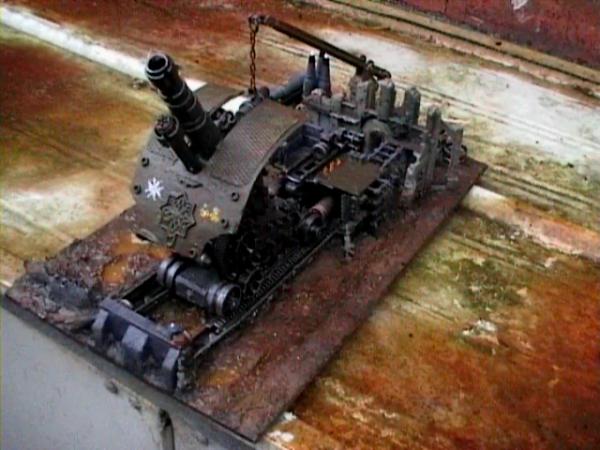 Personally I prefer the more tan colourscheme than the olive drab. I'm planning on using Desert Yellow as a base for my WWI/II IG. I'd paint a lot of the cogs/etc an oily brass, with the odd bit picked out in silvery metal (In the GRIM darkness of the future, there is only BRASS!). The bunker/housing at the rear and rail mounts I would probably paint a concrete grey with sooty black dirt. And lots of mud/dirt everywhere Edit: Also, that is a pretty cool bit of modelling