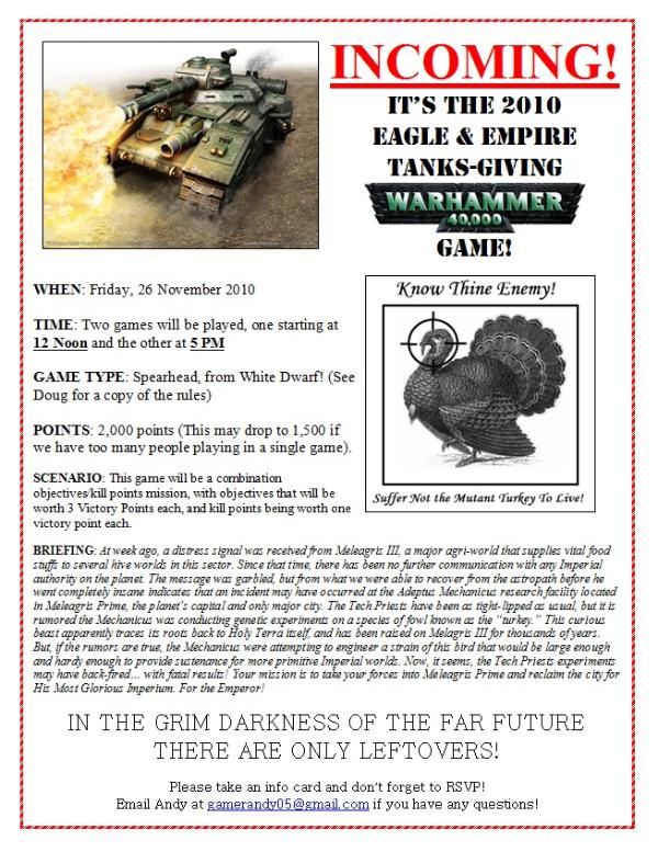 I'm running the annual Tanks-giving battle at Eagle & Empire in Alexandria, VA. Here is a scan of the flyer I posted: