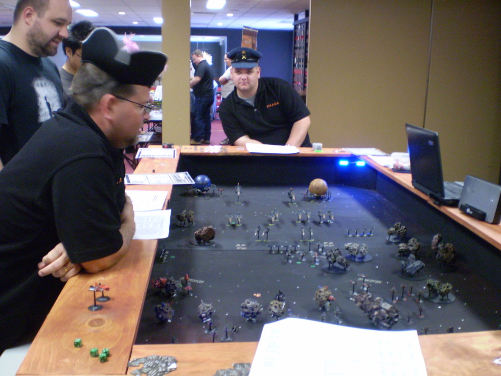 Neat, I've never seen a recessed table like the one you have here. It looks like it works really well for a game like BFG that doesn't have a lot of tall terrain (like 40k does). The rail around the edge for computers, etc is really nice! Are all of the tables at your store like that, or was this part of the custom-built table? I also like the webcam you have set up there (for batrep purposes, I assume?).