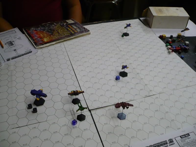 It's a lot of fun to play but a bit complicated. In space, the direction you are pointing may not be the direction you are headed. They did this all the time actually in the new Battlestar Galactica series. For example, I burn my engines to go a velocity of 4 in one direction and then use my maneuvering thrusters to turn my fighter in a different diection so I'm still moving one way but pointing another. All the dice you see at the bases of the fighters are to keep track of the velocity and direction of each fighter. It's complicated because the game designers try to account for every stitch of realistic space movement they can.