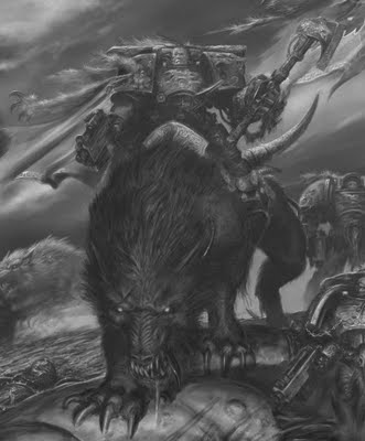 History: He has raged across the battlefields of the 41st millenium hoping for the glorious death in battle that has awaited him these long years, he avenged the former members of his thunderwolf cavalry pack along time ago and rides into battle astride his massive thunderwolf and old friend: Bloodmaw. His pack was decimated by fanatic worshipers of slaanesh when they detonated a massive explosive as his pack cut through them, only he survived and he and his cybernetically repaired friend have become almost a legend in that noone can kill them, his hands brought down a bio titan of the tyranid horde as it was approching a settlement of the imperium and then he dissapeared, the near victems of the monstrosity unable to laud their saviour, he now travels in a borrowed transporter of his Ordo Malleus allies strapped into the core of Bloodmaws robotic frame he dances a bloody crusade across the galaxy.