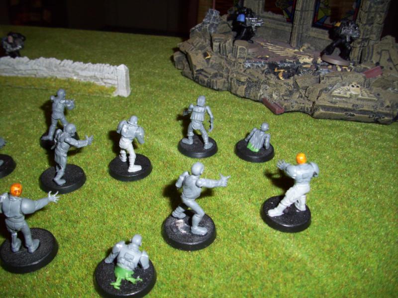 The zombie horde slowly continue to plod towards the waiting Space Marines gun line, body parts exploding with bolt shell after bolt shell impacting within their ranks.