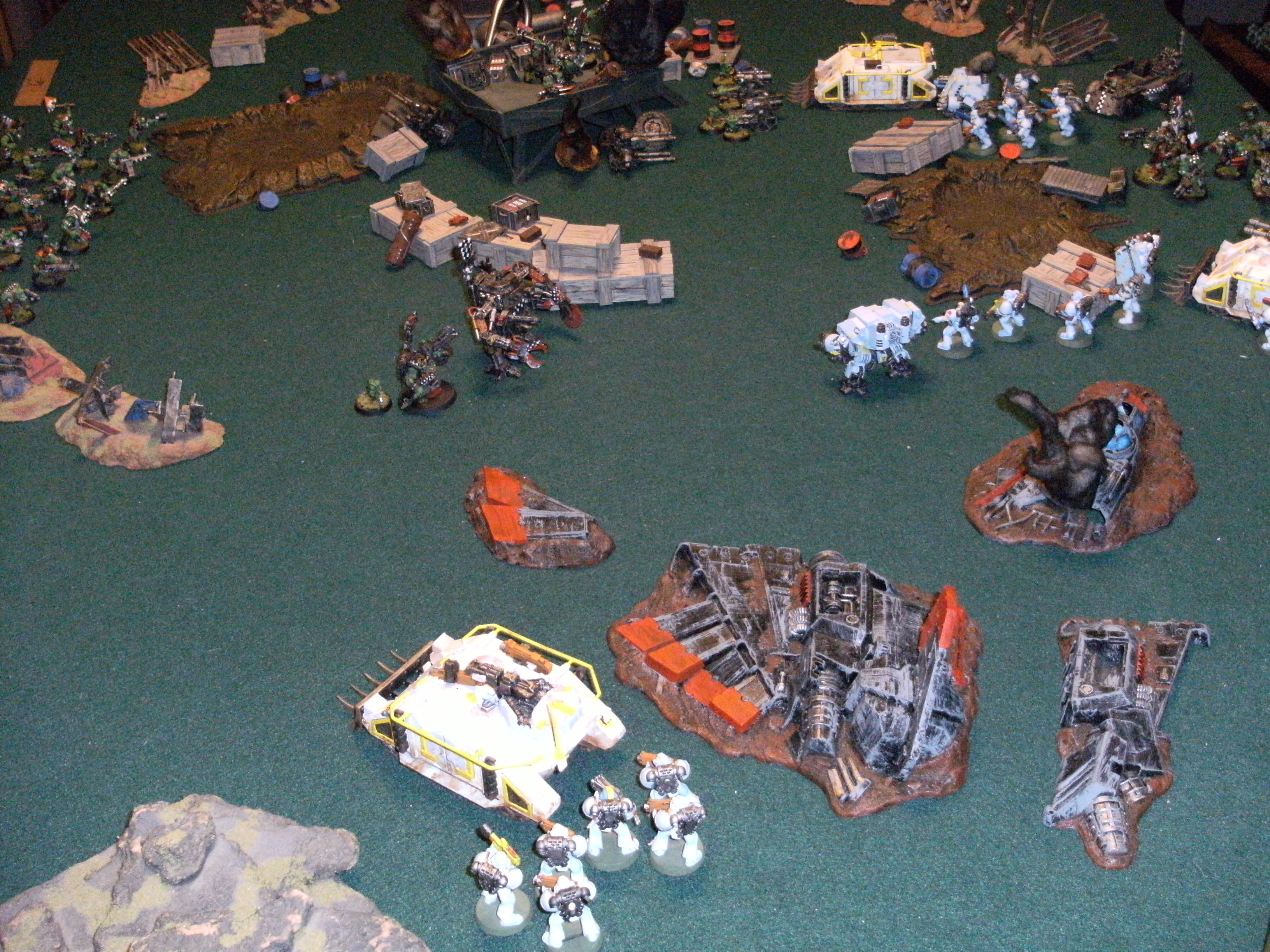 Well, the picture certainly makes me want to read a battle report. The armies look well painted and the terrain is cool. My only question is, "Why in the name of Gork and Mork would the KFF Big Mek be all by himself, out in the open like that!?! He basically has a bullseye painted on his forehead!!!! Anyway, would love to read the battle report.