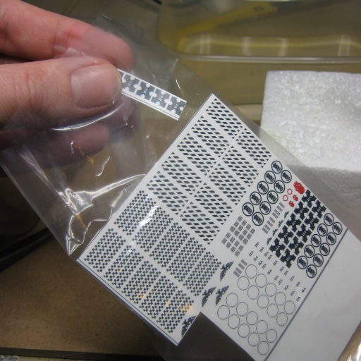 Step 2: Put the rest of the decals away. You don't want to splash them, spatter them with paint or otherwise mess with them right now. They're safest in a baggy and put aside. Honestly, don't skip this step - only have out the decals you're actually going to be immediately working with.