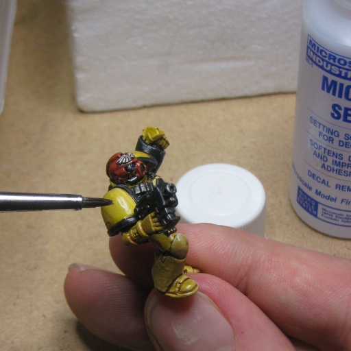 Step 0: Gloss the mini! This is important, you need a flat, smooth surface for the decal to sit on. Matt surfaces have a roughness to them that will trap air under the decal, causing it to silver. You don't want this.