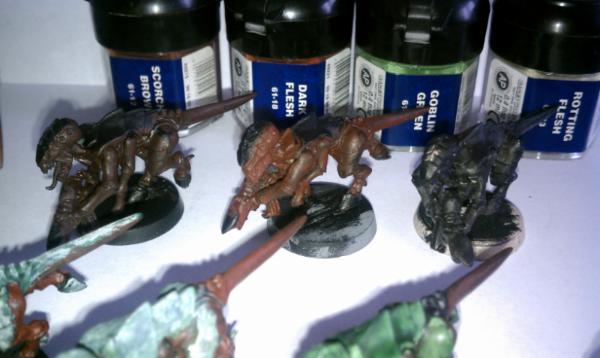 Model on the back right is primed black. Model on the left has a coat of Scorched Brown thinned down by water, and the middle has a second brownish coat- this time in Dark Flesh.