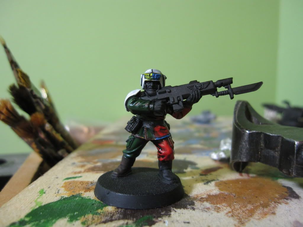 Here is a split guardsman I did. I think I'm going to go with the red/grey side which is a copy of an army I found online. It looks ceremonial rather then camo and the army will be more along the lines of proud Praetorians then modern-day forces. Let me know what you think please. I really do need help deciding. Its not a fair comparison as the green side is just standard Cadian variation. I wanted to compare to that. The entire thing took about 50min so hopefully the grunt painting will be easy.