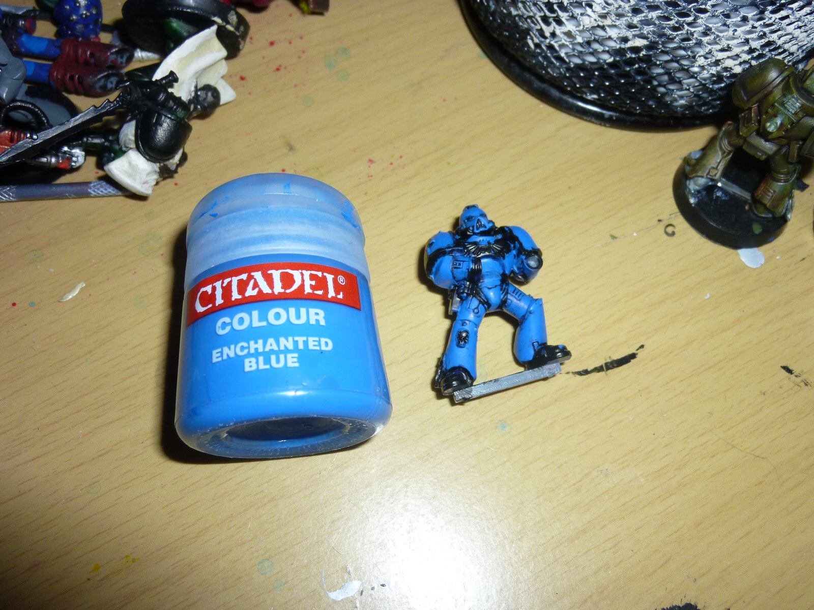 Why not use Ultramarine blue instead of Enchanted Blue? Enchanted Blue is the 1k Sons blue. (although I mix it as Enchanted is too bright for me - but then again my first layer is a mix outta brown and blue to give it a used look.) Either way, it's looking good!