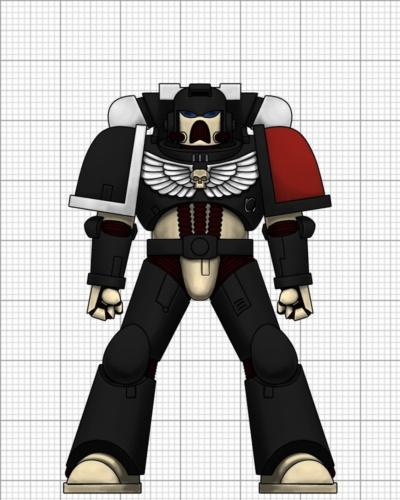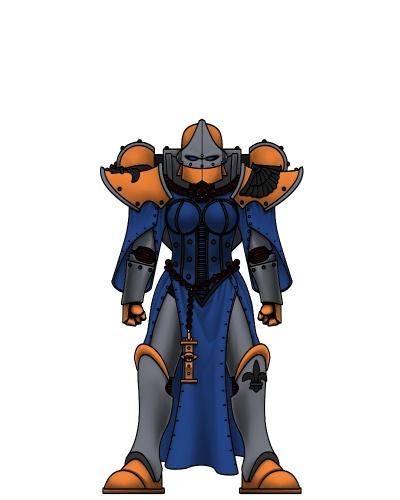 My other major thought right now would be to go with a more or less black and white scheme. I like the black and bone, as it gives a somewhat ominous, skeletal look which I REALLY like. Another thought of mine though was to so them in a ceramic-looking black with pearlescent white, which could end up looking nice and cool and clean. What I'd need help with on this one is fleshing it out a bit more. Both the marine and sister schemes need fleshed out in terms of trim and whatnot, including the armor trim, icons/aquila, and all the cloth colors. All of the pure white areas on the sisters are up for debate; consider corresponding areas on the marine to be as well. One of my thoughts was to do their cloth in varied bright colors or even a tartan scheme as a Celtic/Boudicca-themed force, but I'm worried that that would both clash with the rest of the army and take an ungodly amount of time and effort to paint. Could end up looking REALLY cool though. I hadn't had many other thoughts on the trim color there, other than that I tried mechrite red and it looked kind of gakky. For