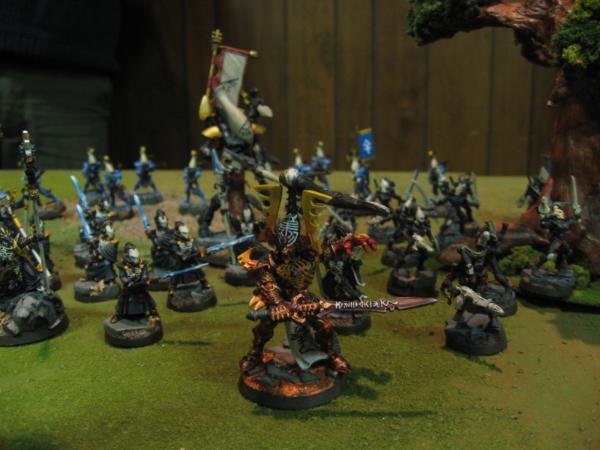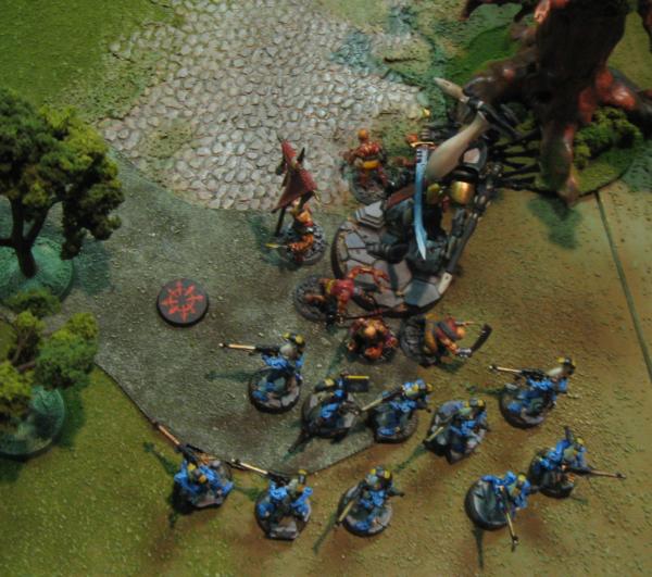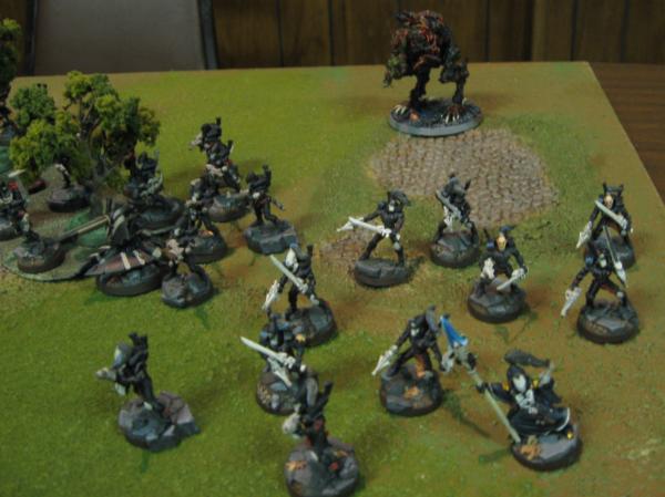 The Eldar maneuvered within their lines a bit, the Avatar and Seer Council wheeling right and positioning themselves to meet the threat of the Bloodcrushers and Bloodthirster, the two units of Dire Avengers grimly leveling their weapons and preparing to Bladestorm.