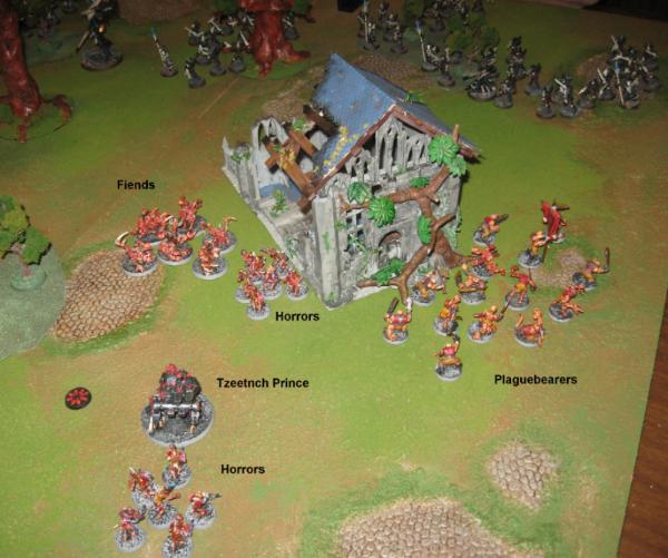 Drawn by the spill of blood and shrieks of pain, more of the Harrowed took form, animating the imperial corpses and war machine wreckage that littered the field. The Fiends materialized, as did both packs of Horrors and the Tzeentch Prince.