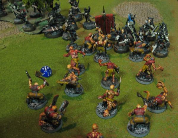 On the right flank, the Plaguebearers charged at the Eldar troops guarding their objective, flooding into one squad and just managing, with a single Plague slave, to reach one of the Guardians in another.