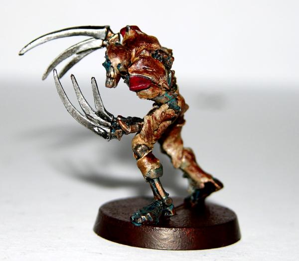 I've just had another go at painting a Necron Flayed One; although I'm reasonably happy that I've managed the leather look to the skin that I was going for, I'm worried that it lacks definition and contrast to the metal portions. I was thinking of doing a thin, broken line around the edges of the skin, but I'm not sure what colour to use.