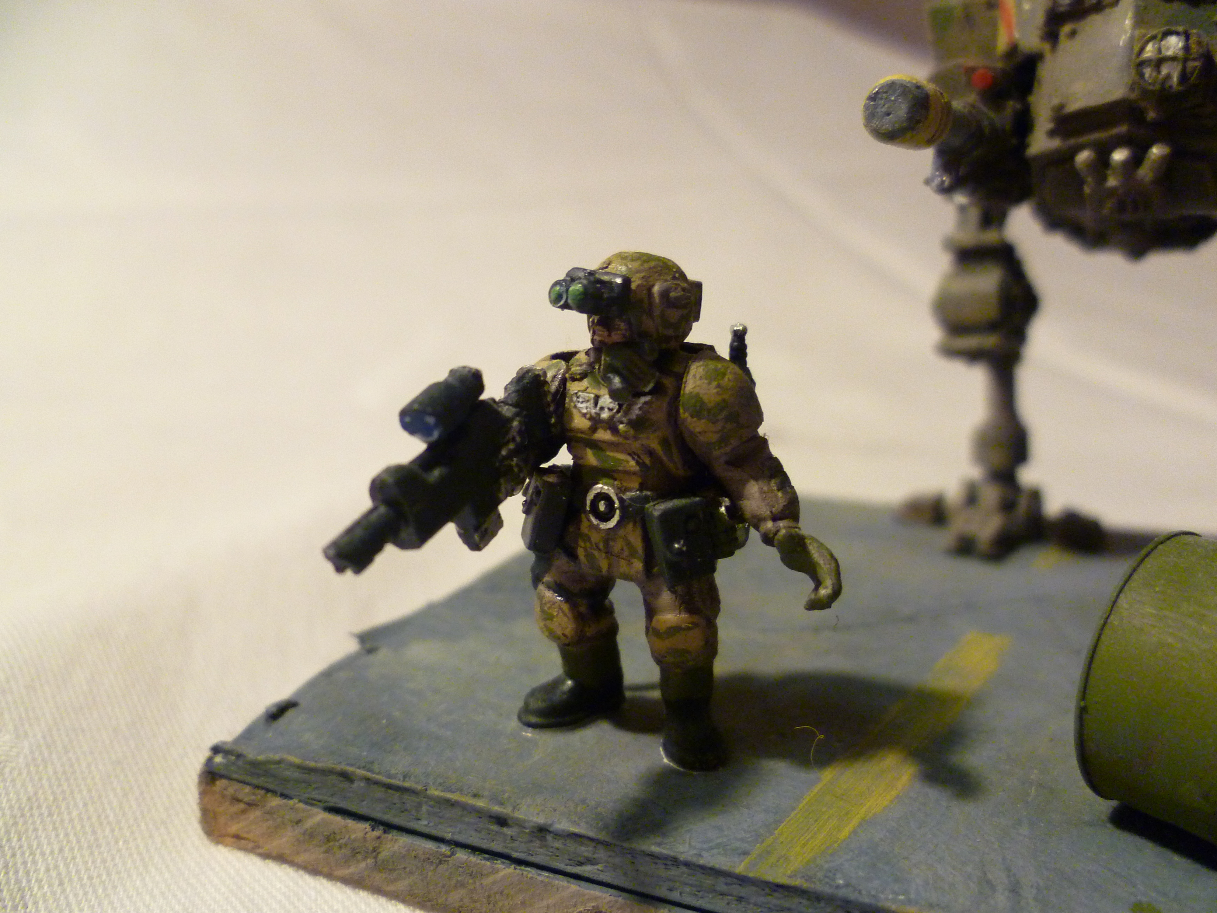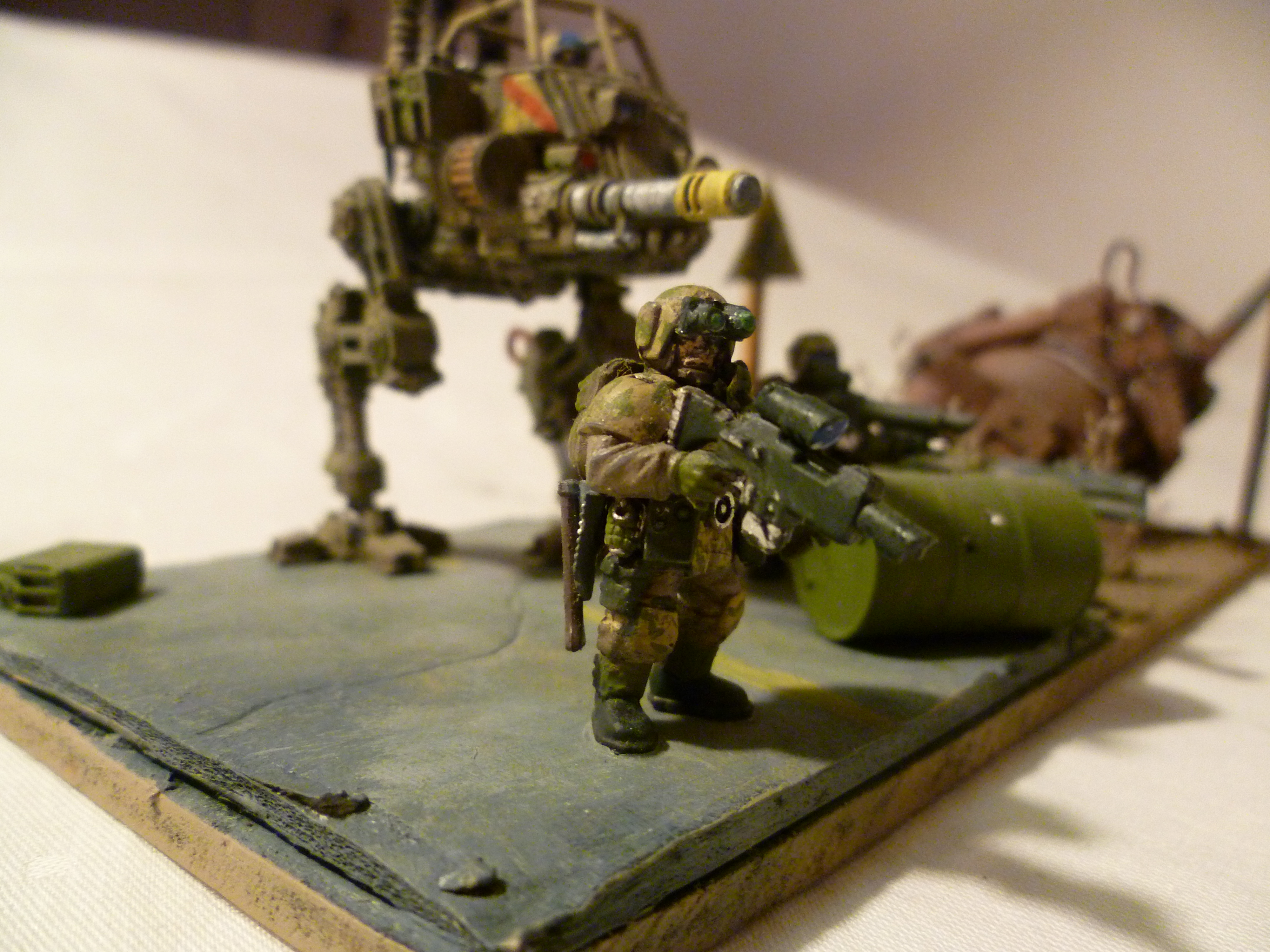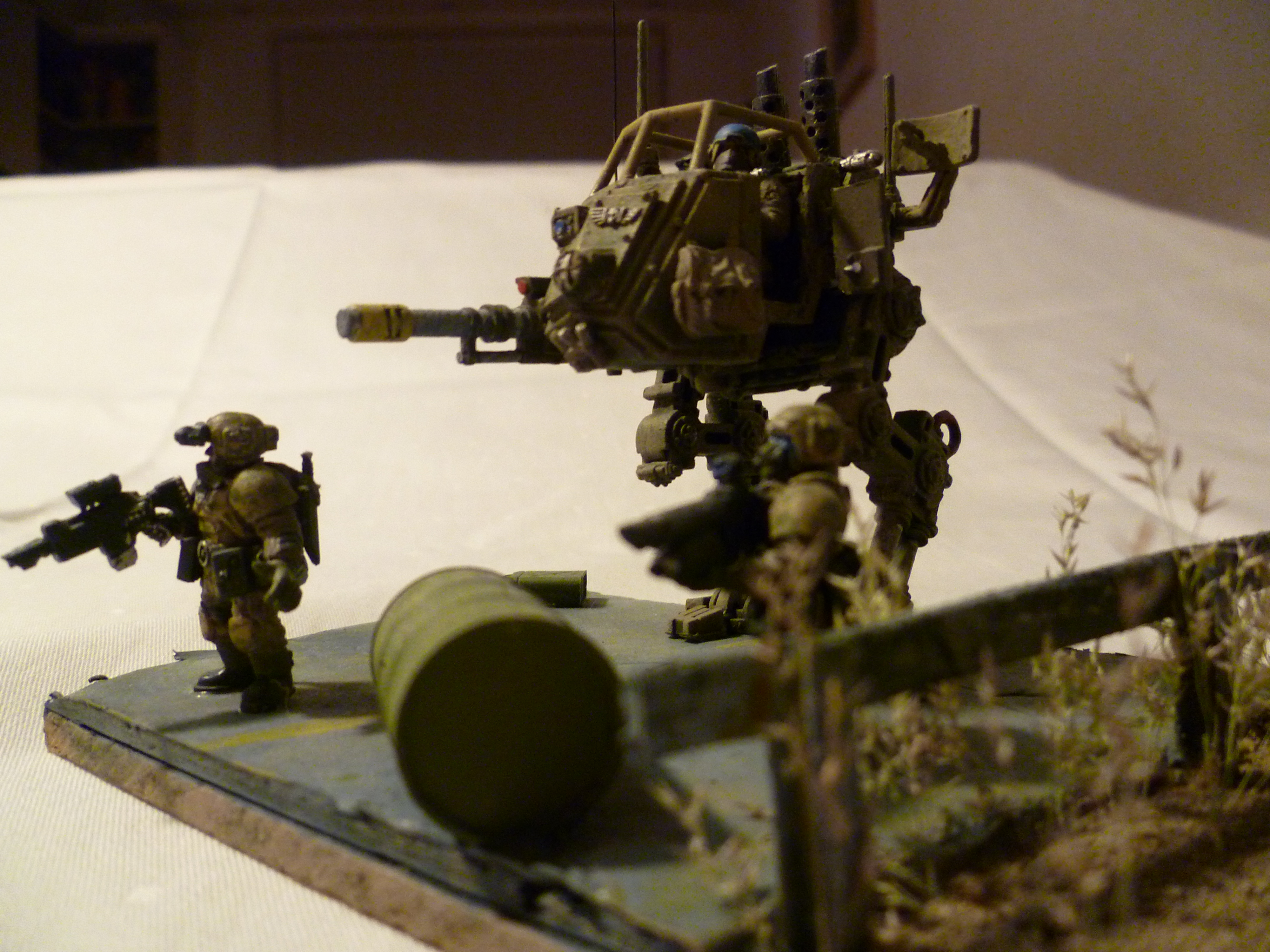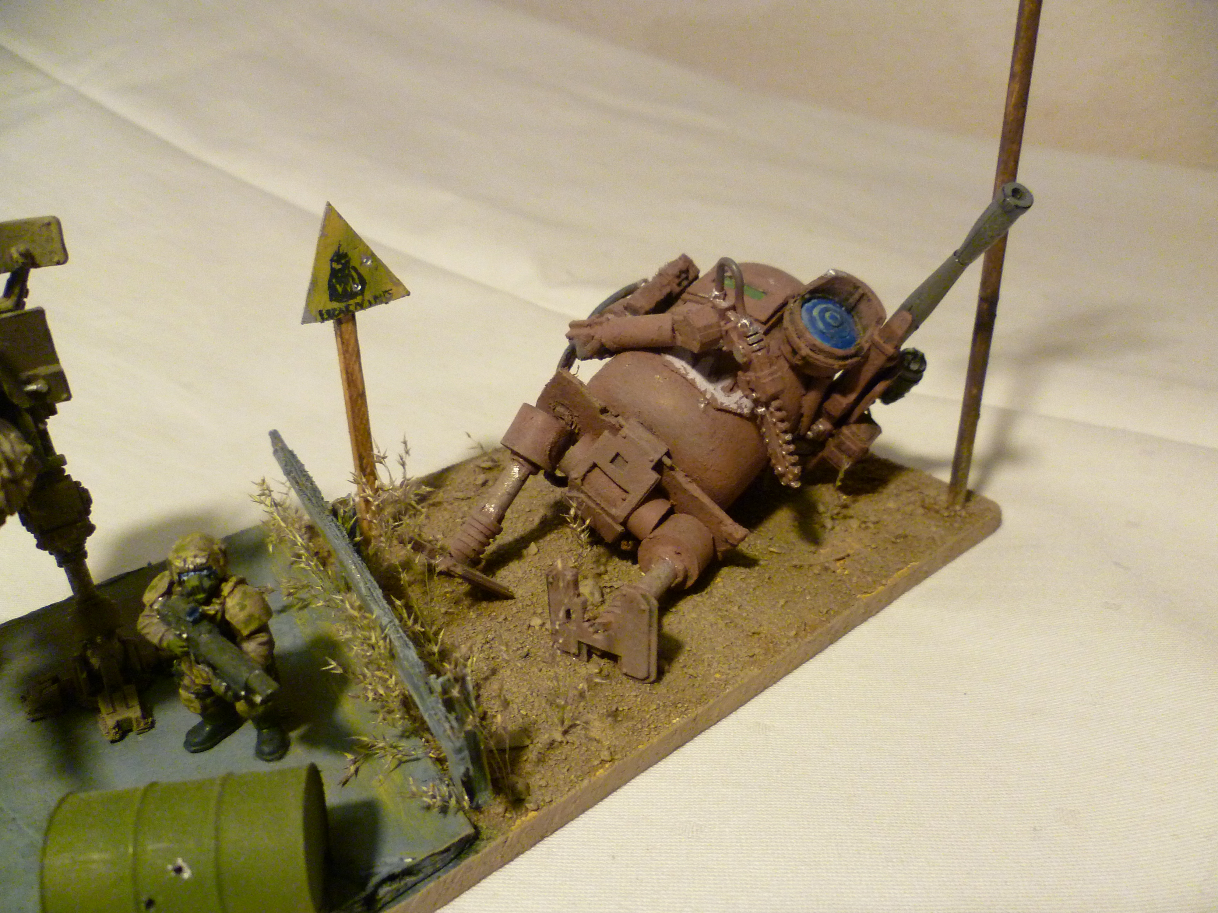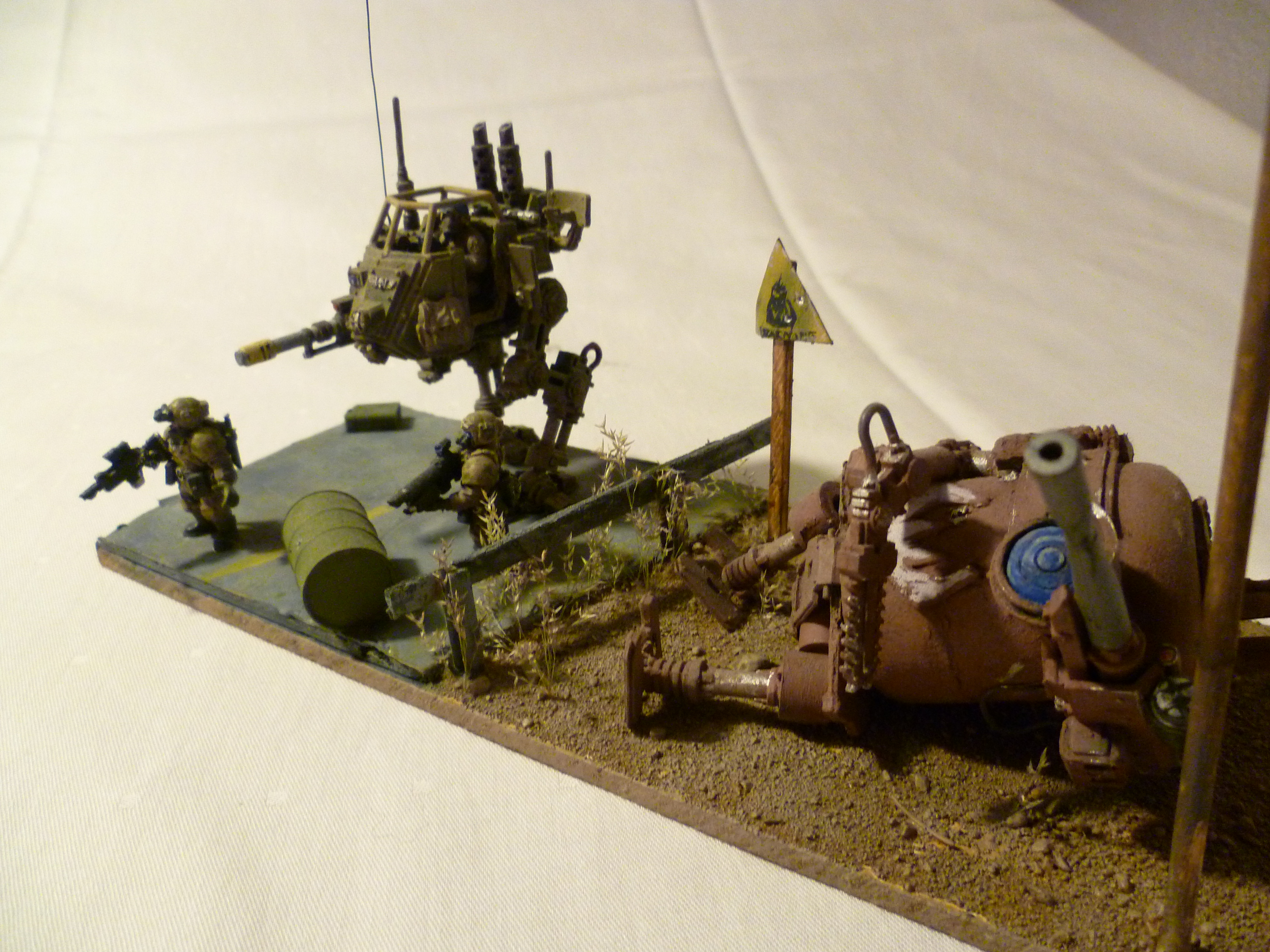 I think it's an interesting idea, but the composition could be better. When I look at it, there is no story that jumps out at me. You said that the sentinal destroyed the ork vehicle but the sentinal isn't pointed at the ork vehicle and it doesn't seem like the ork kan has any battle damage. Right now, everything is lined up looking off the board. Why not angle the sentinal so that it's looking at the damaged kan it just killed, with the guardsman off to the side, but inspecting the same kan?