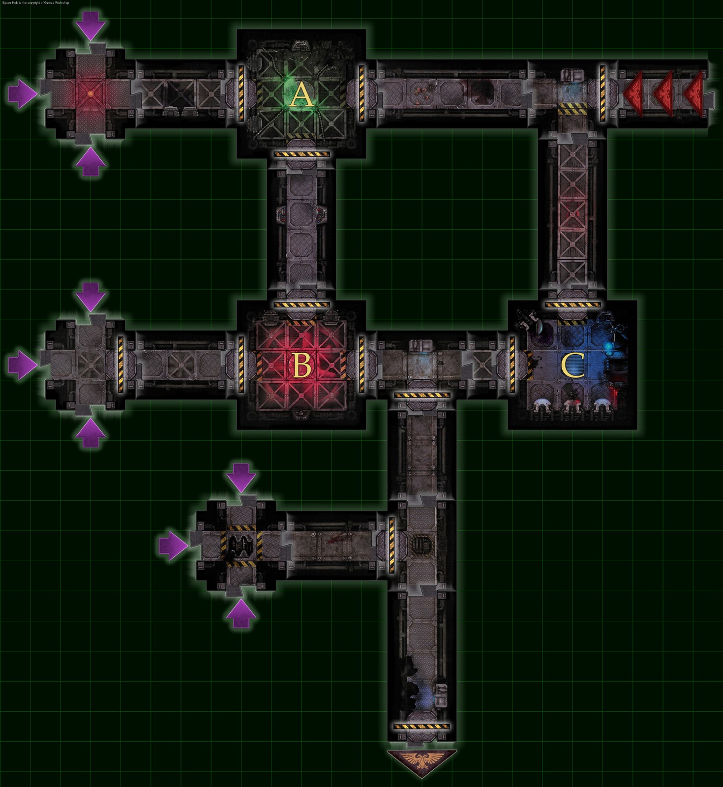 Bombs: In order to achieve their mission goals, the Space Marines must place and arm bombs in the rooms marked A, B and C. In order to place and arm a bomb, a Space Marine must be standing in the room and expend a full four action and/or command points.