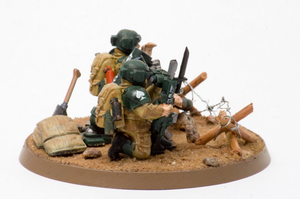 Very nice looking, very nice indeed. I really like the empty shell casings next to the heavy bolter and the slings on the lasguns. Now that I've given you a couple positives, here's the one negative I could find: the clothing and backpacks look a little flat. I see some shading goin on there, but maybe on the next ones hit it with a wash (or another one). Even with that, they still look better than mine do!