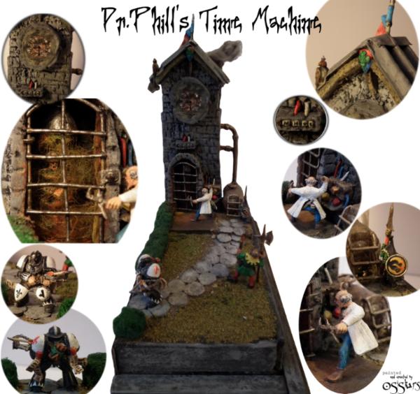 The barrel contains precious oil and Dwarf gyrocopter fuel mixture that operates the time machine. The barrel is made out of cork and some metal pins and lego driving wheel . The pipes are made from just steel wire and green stuff .