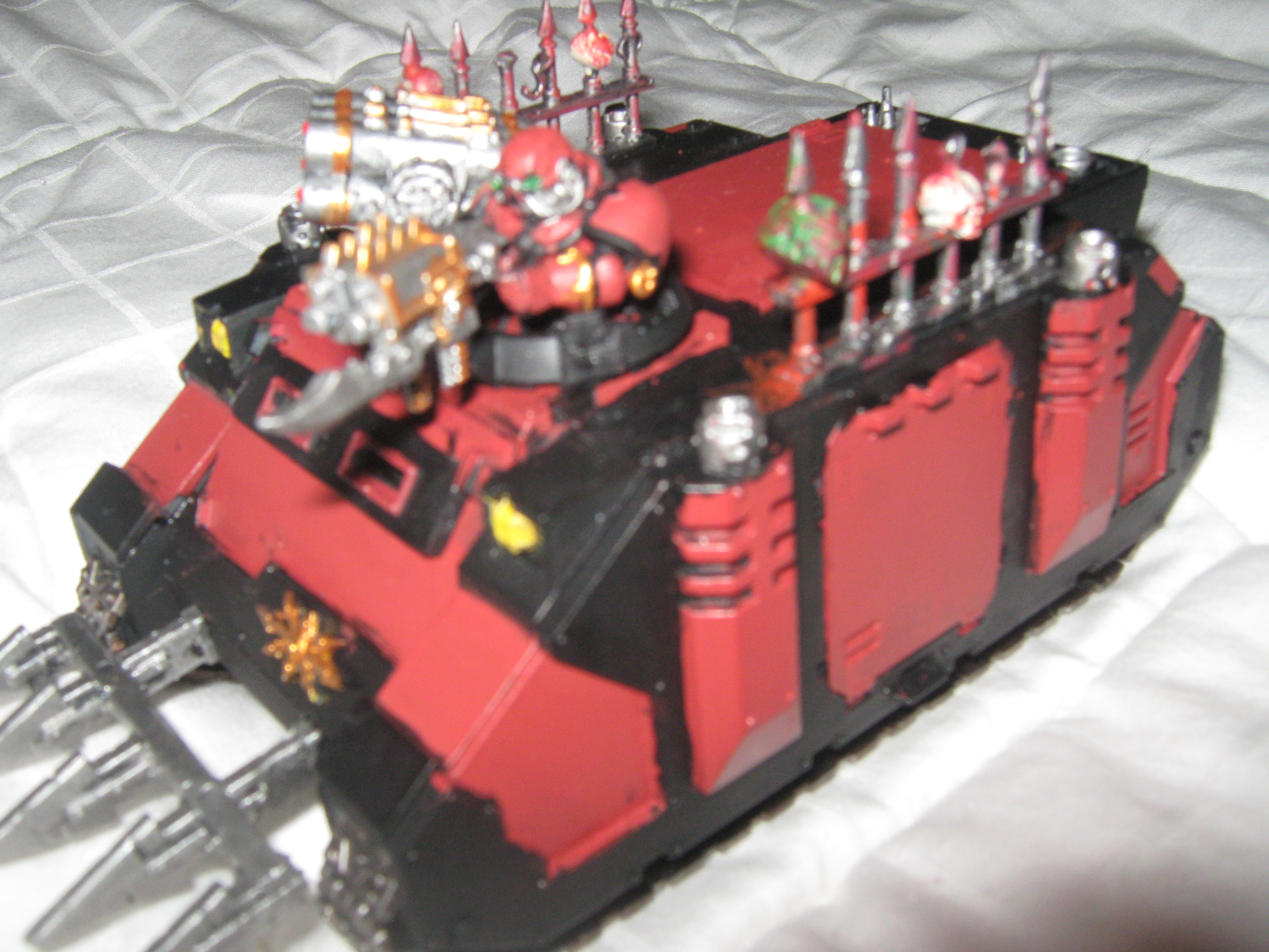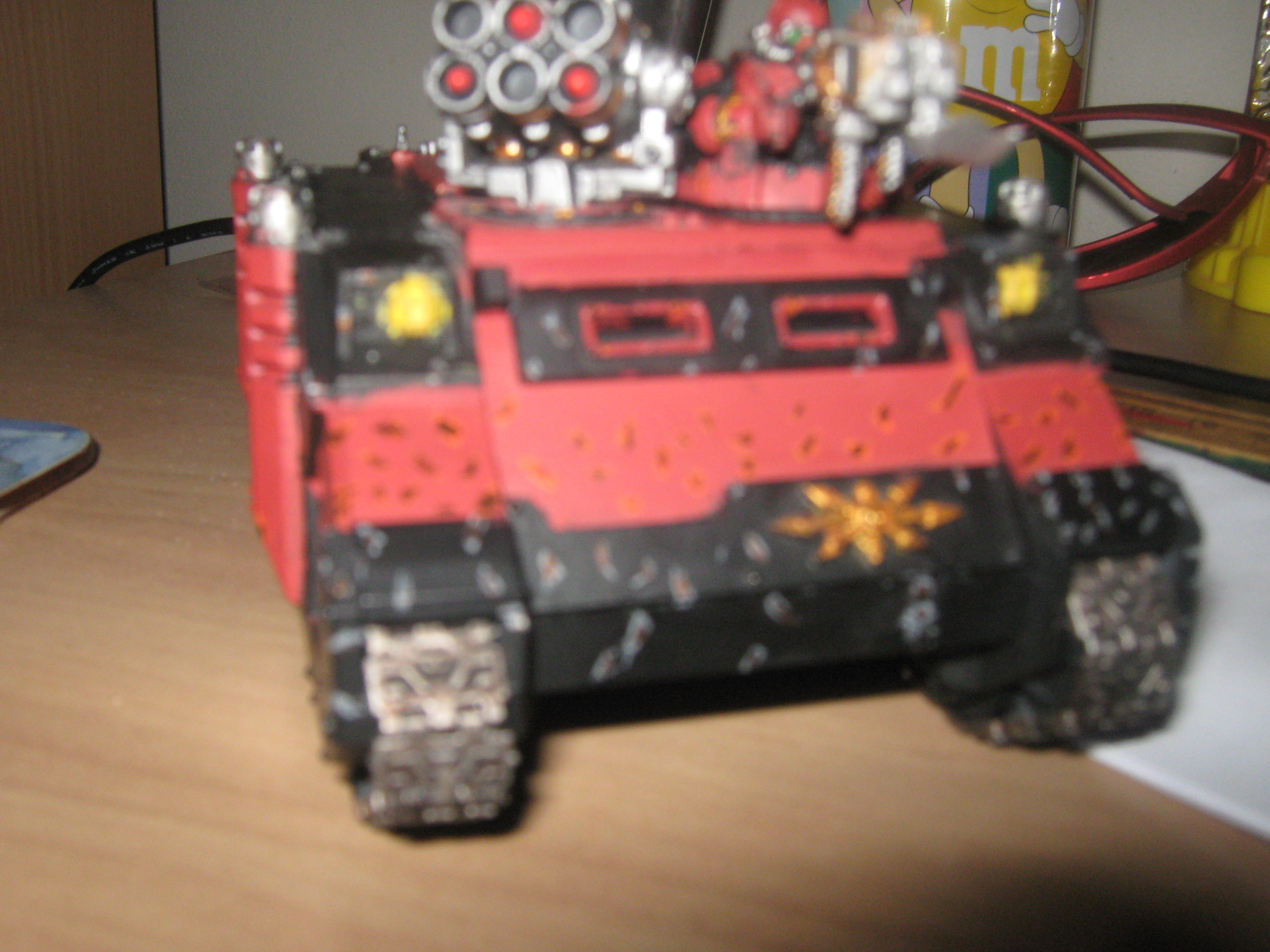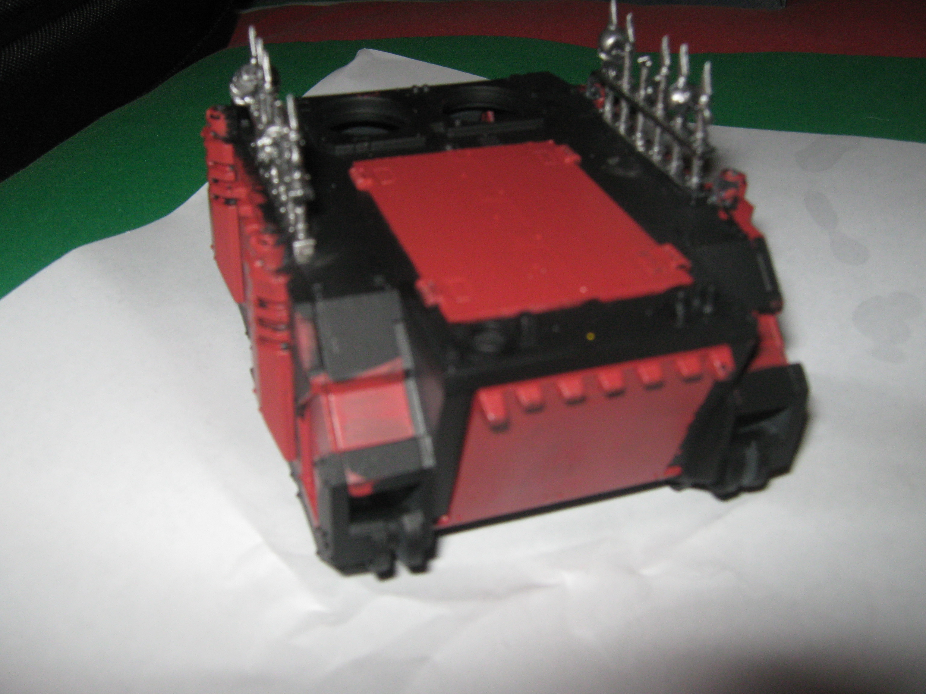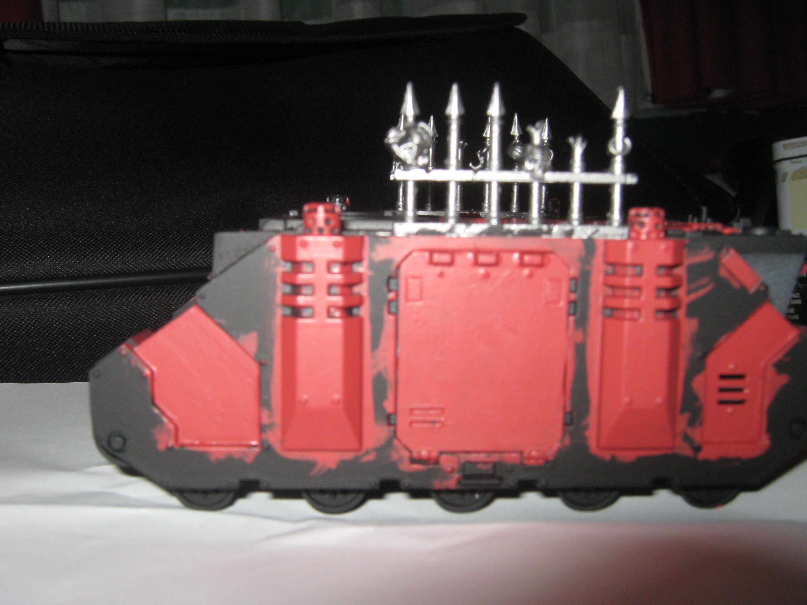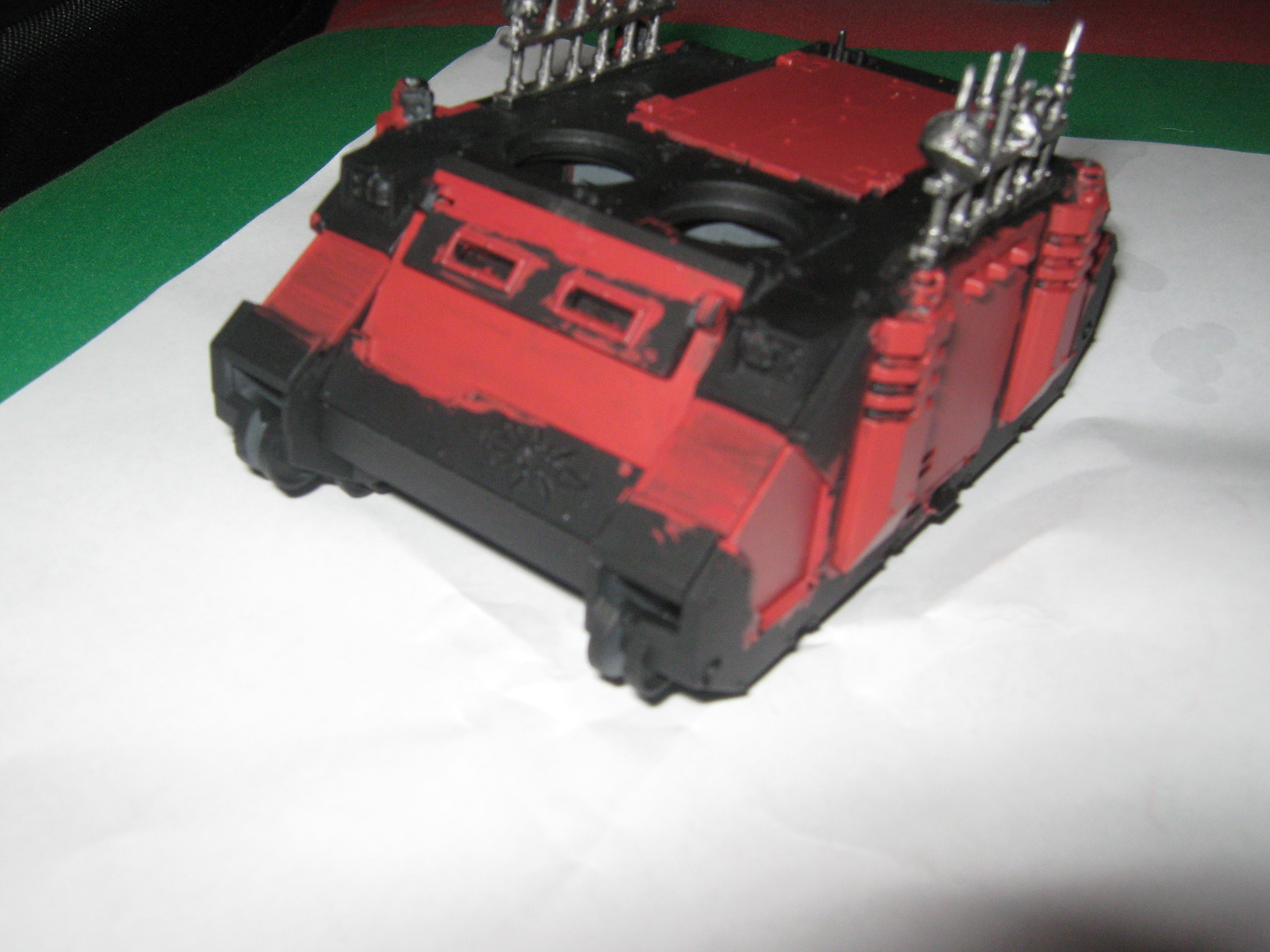 I started painting my rhino today and the paint scheme is red and black for the Red Corsairs as you can see it is painted terribly but that is only the basecoat, I'm doing all the red panels and stuf first then I'll starttouching up and highlighting then all the other details, I'm pretty new to painting so this might take a while.