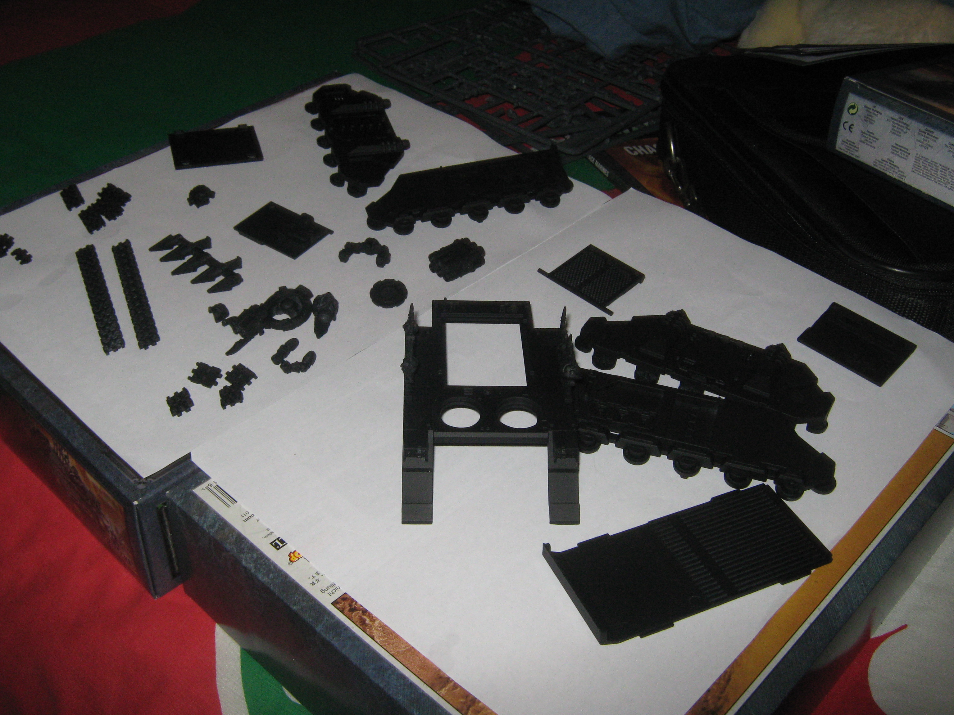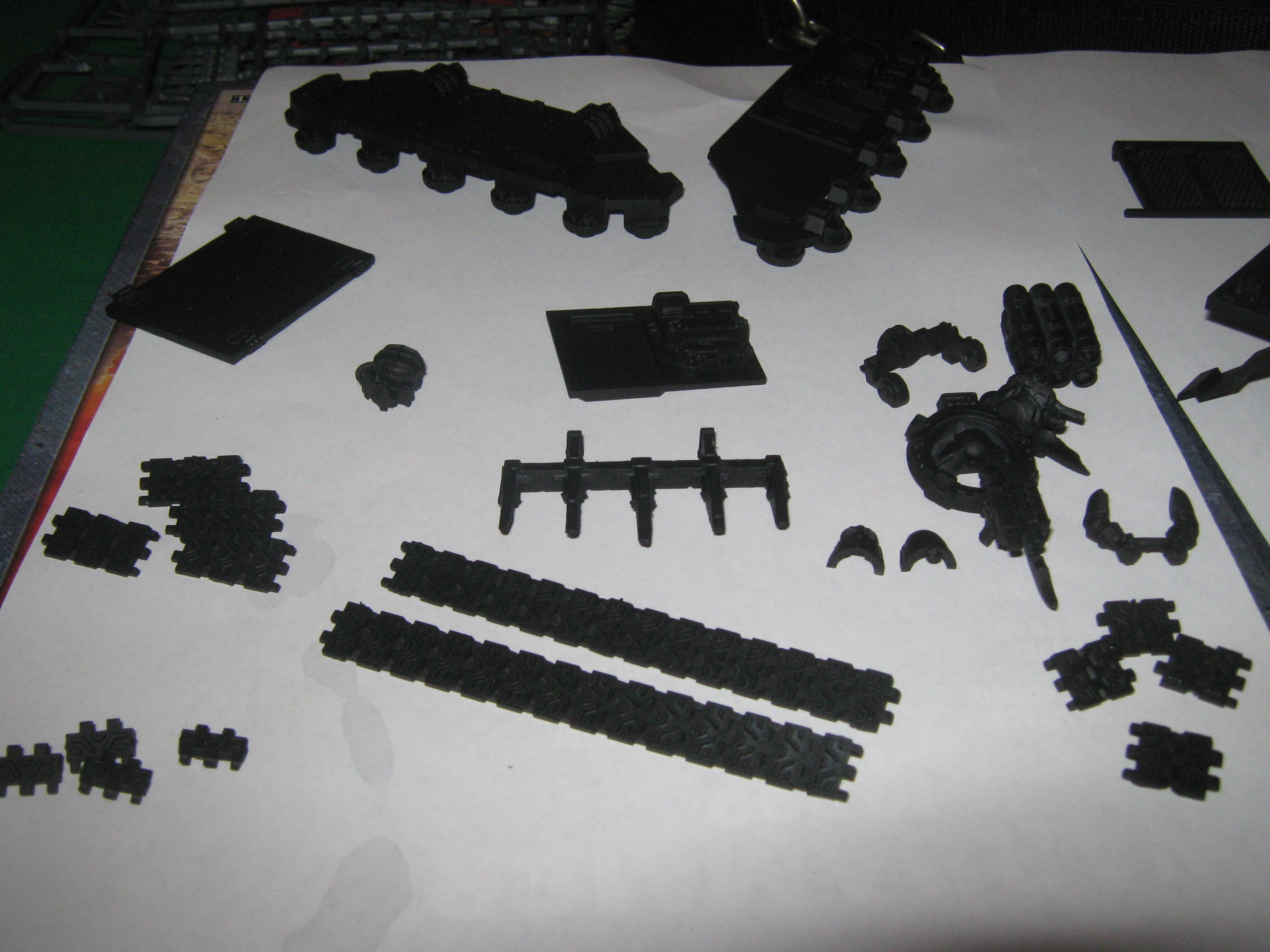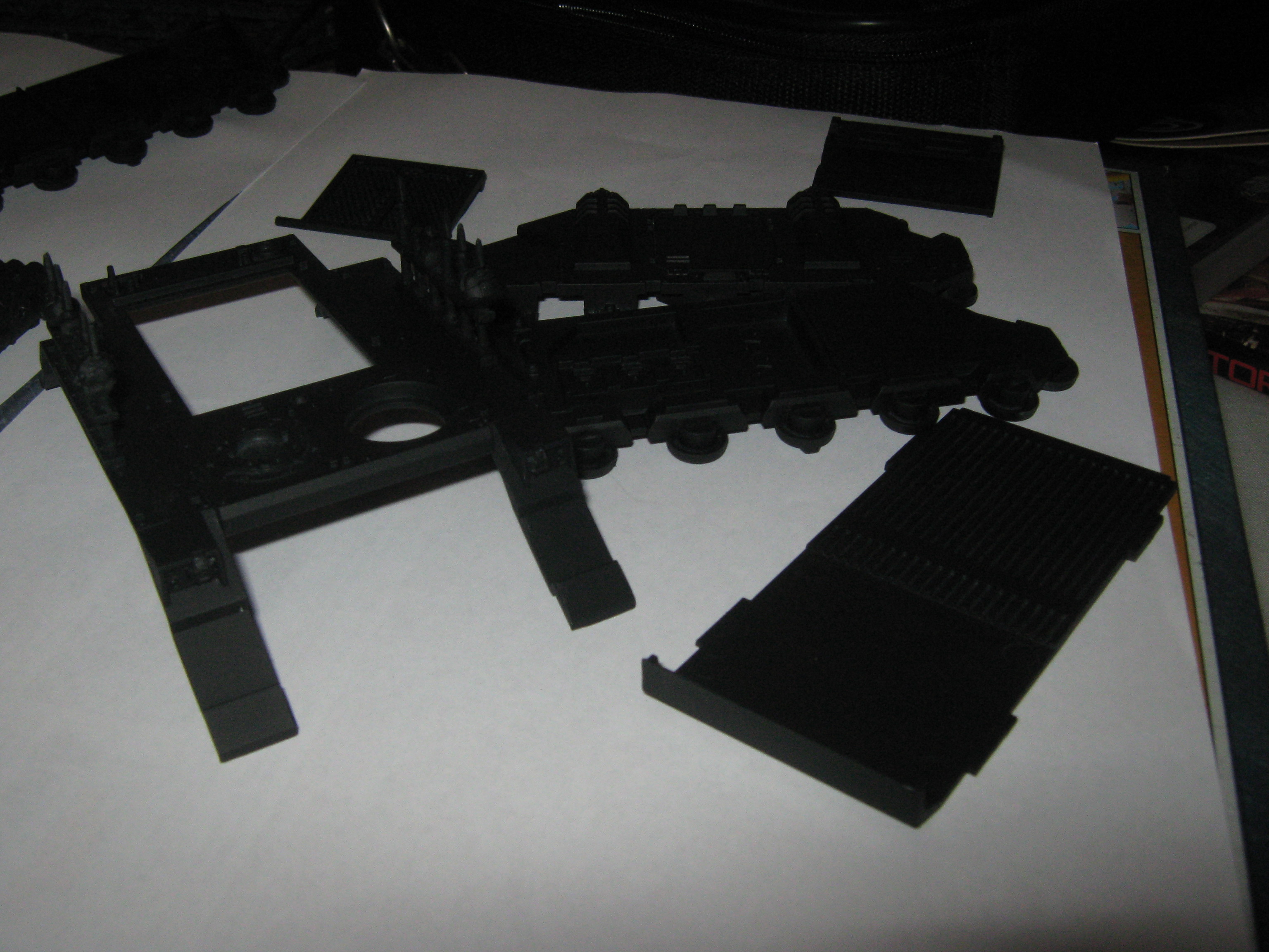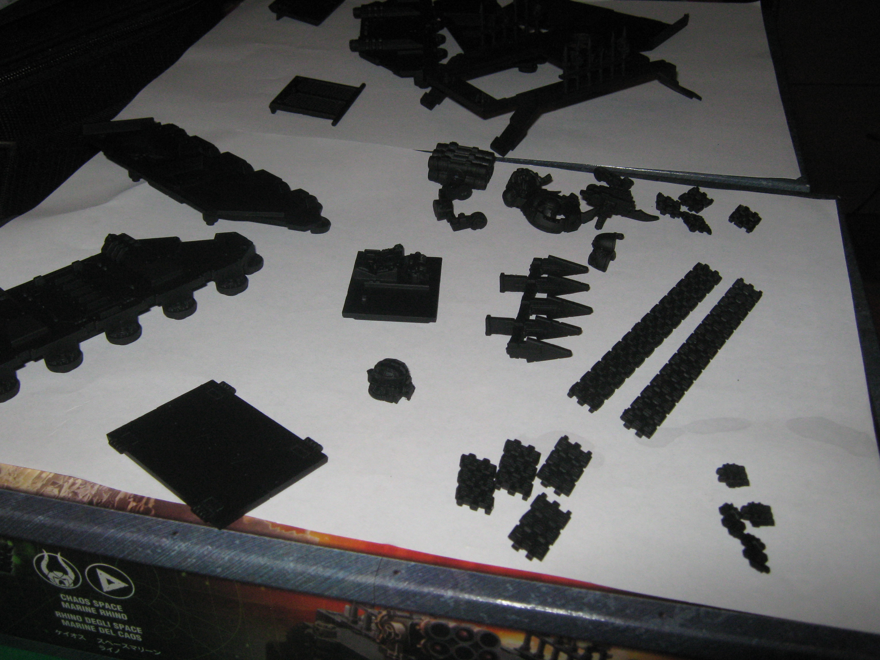 these are pics of my chaos rhino in pieces, they are all undercoated with chaos black spray and I have decided not to glue the pieces together until I have painted them all. The only parts I have glued together is the CSM legs to the hatch, the two roof doors, the spikes on the roof , the choas icons and the side doors.