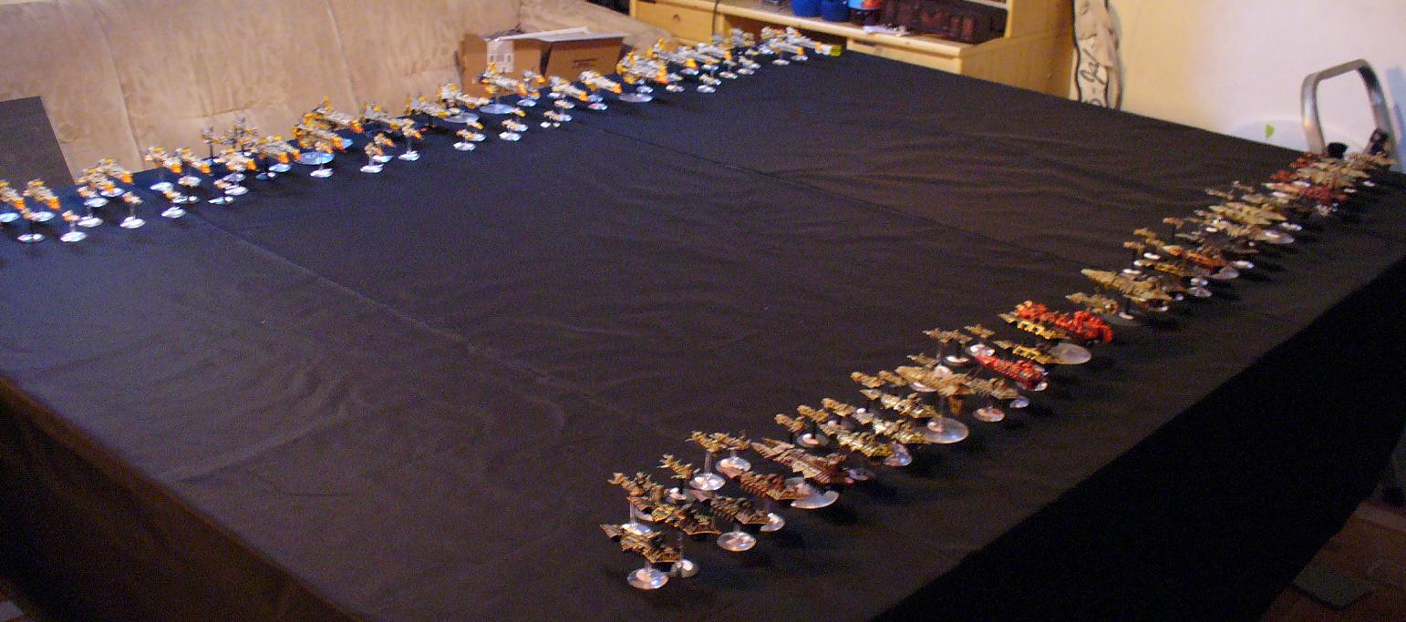 In fact there was very much tactical thinking involved. Only because of the huge number of ships. Where to use youre rerolls for example, you can imagine, 4 Rerolls is not much to spend when youve got a fleet as big as that. The Table was 1,5 M x 2,2 m We felt that was enought becuase as we know from futher games (4-6K each side) youre gonna put youre ships close to eachother anyway. And in such a big game, there is in some case even more tacital involved, becuase other then in small games it happenes very often, you get port and starbord weapons to use in the very same turn. And you very often got much more targets "muuuuch" more. And you have to decide which ship to use first becuase you got so many targets infact. What I do agree with, is, there was not much tactic for the escorts. In such a big game they are little more then "Shields" and so they all got whiped out very early. You should try a game of that size somewhen  You'll see how much tactical is involved in it hehe