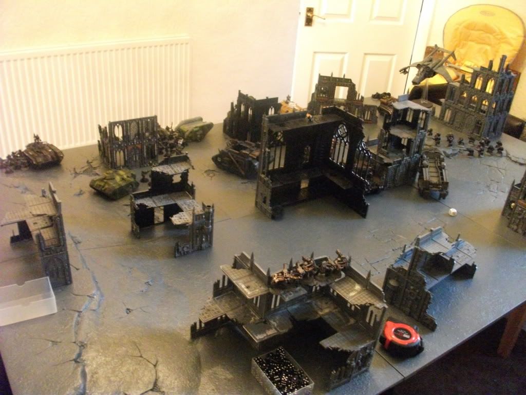 Shaun deployed his Guard spread across the board. He held most of his tanks close to the board edge so it would take longer for me to charge. He put a Vendetta in each table corner to cover all angles and hit the Manticore in a ruin, the Hellhound close by to BBQ any would be assaulting units.