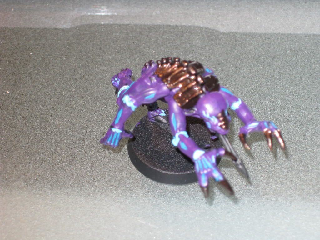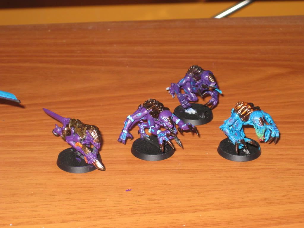 I got a bunch of Tyranids for Christmas because I wanted to start a new army in 40k. As it turns out I'm stepping into a tournament next weekend, and I want to get a lot of my army painted. For the past two days I have painted a few guys with this basic scheme: Tin Bitz chitin, Liche Purple body, and Hawk Turquoise and Ice Blue details. Of the genestealers I have painted, my counts as broodlord is colored differently to distinguish him from the other stealers. The paint scheme looked really neat in my head, but on the model it doesn't seem to be that good. I'm not sure what to do, but I also don't want to look like an idiot with a patchy army when I go to my FLGS. What do you suggest dakka? I like blue colors.