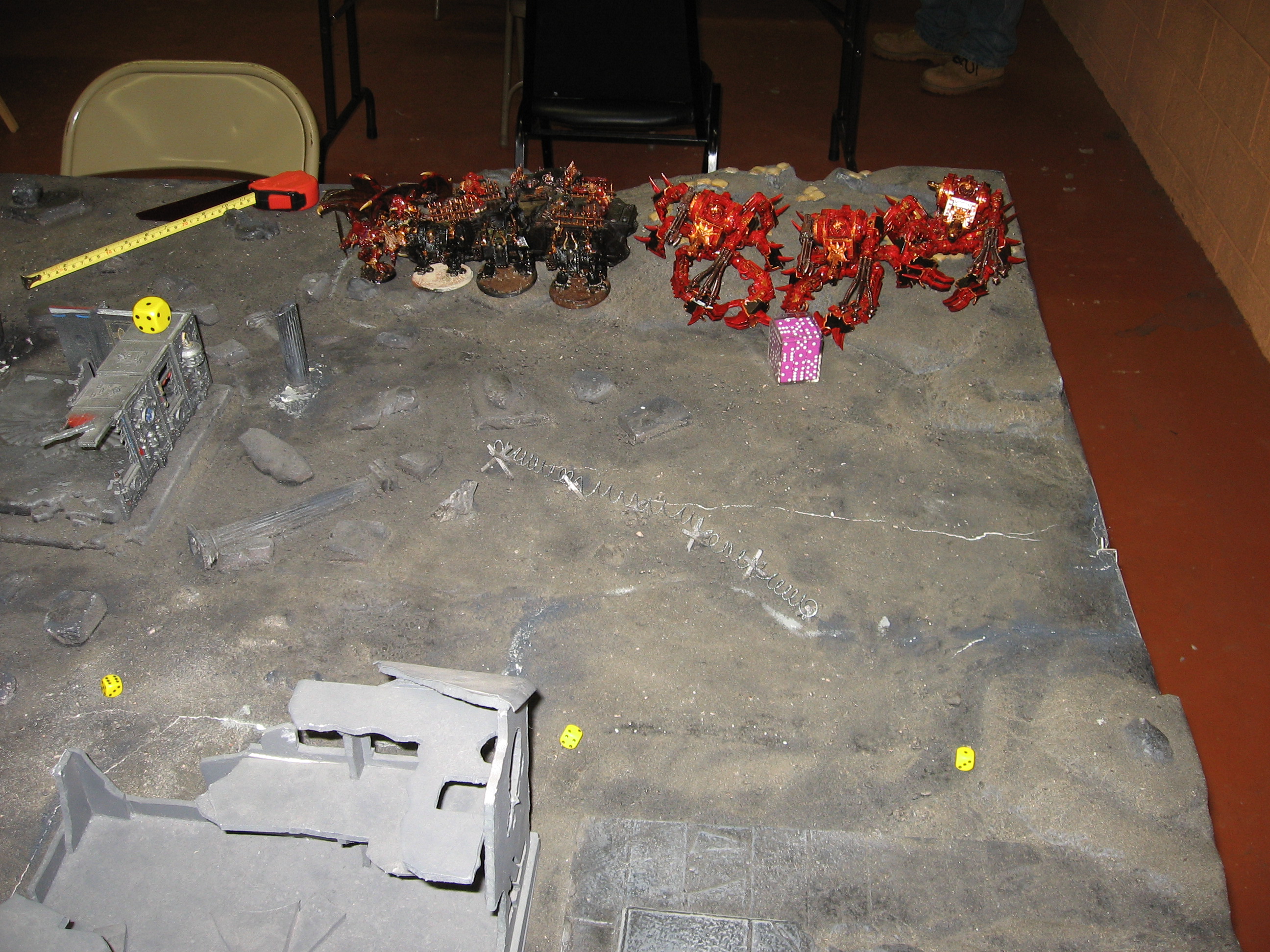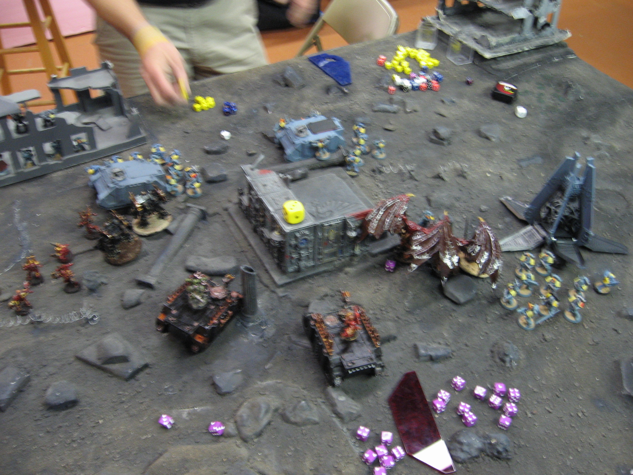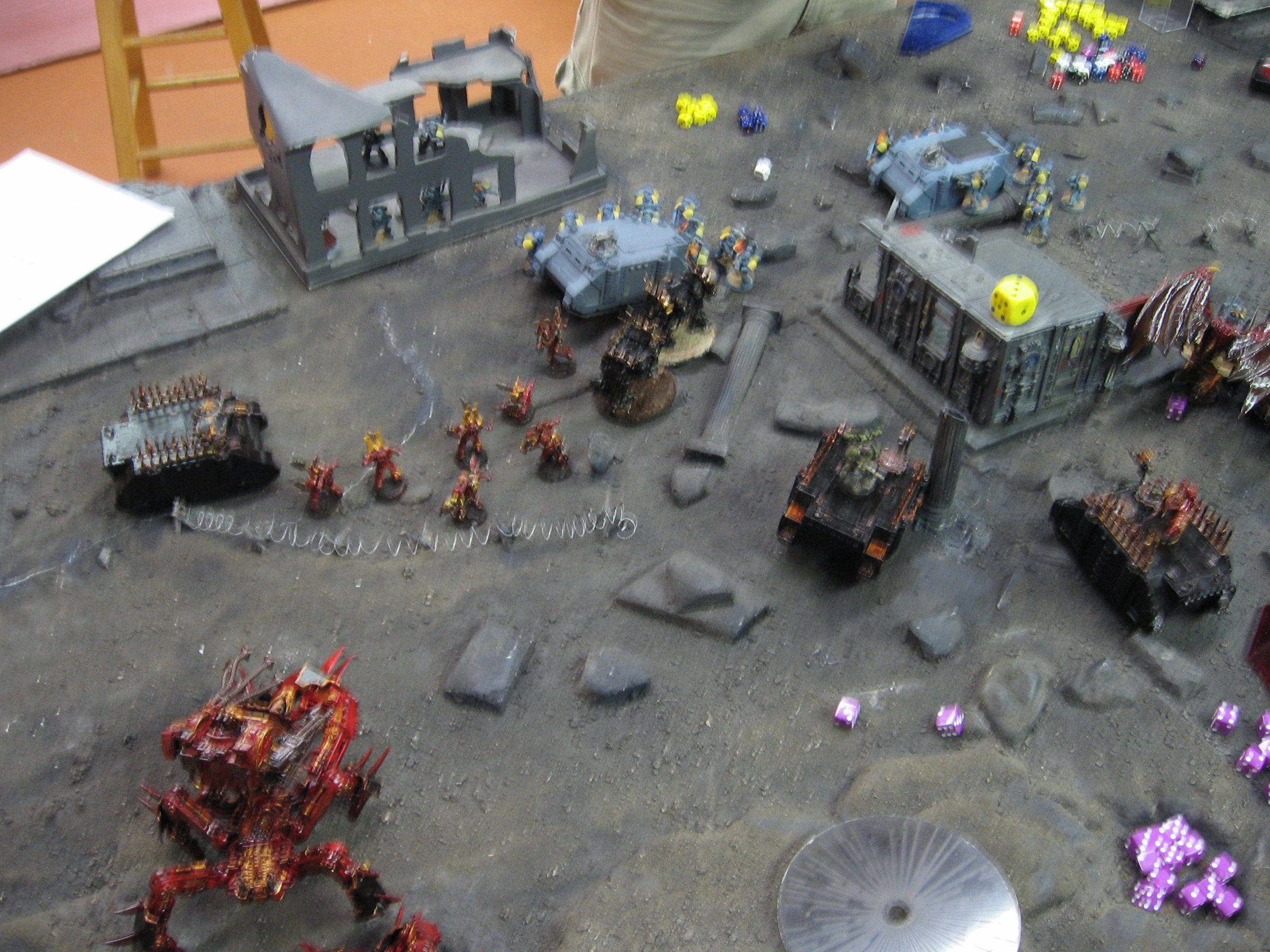 Keith drives 12 and hops out to melta gun my dreadnoughts. He immobilizes one. Long fangs immobilize and weapon destroy the defiler. he kills the battle cannon. He kills the plague marine rhino with melta,and rune preist kills the other dreadnought. By the drop pod, melta guns wreck the berzerker rhino. Everything he has shot so far has died. This concerns me. Daemon Prince keeps fighting the thunder wolves, does 1 wound, takes none.