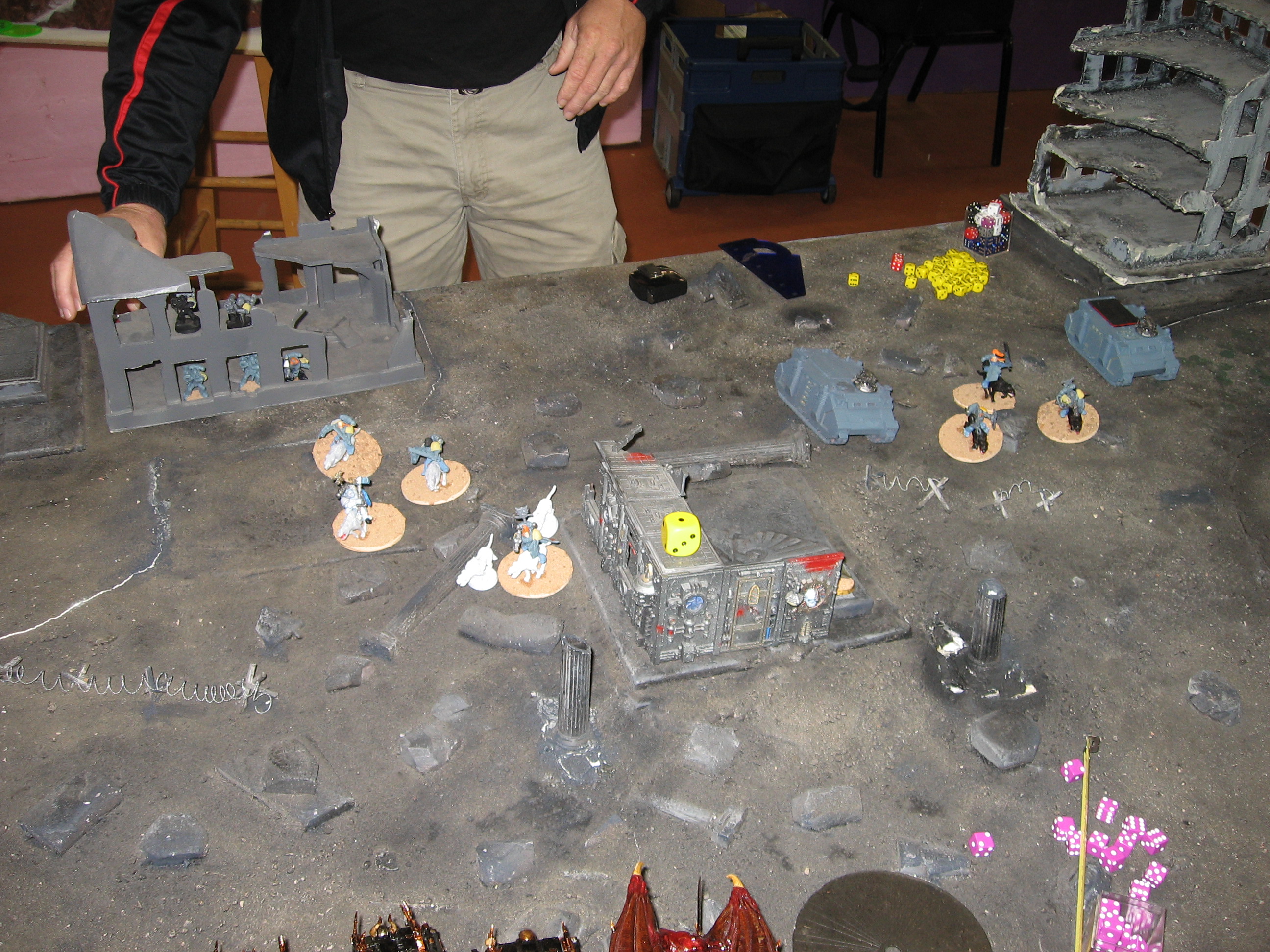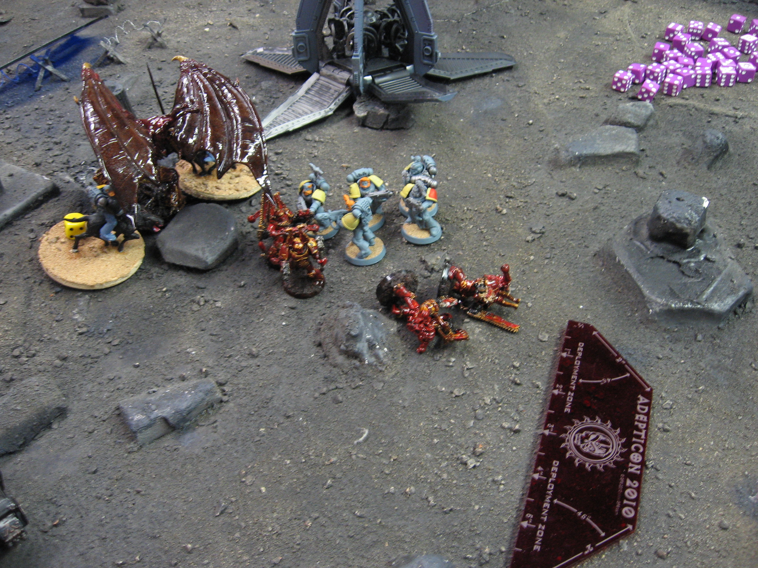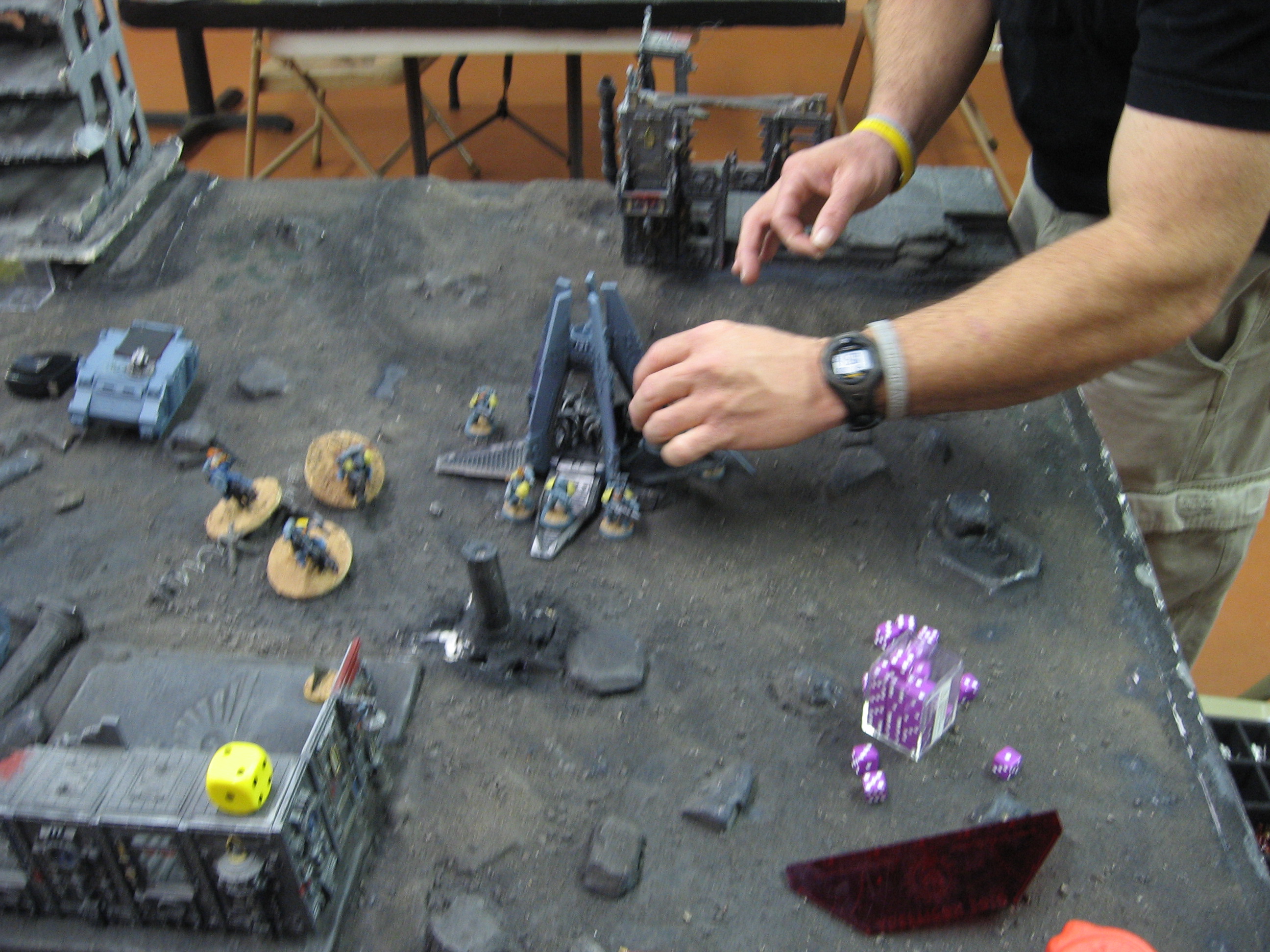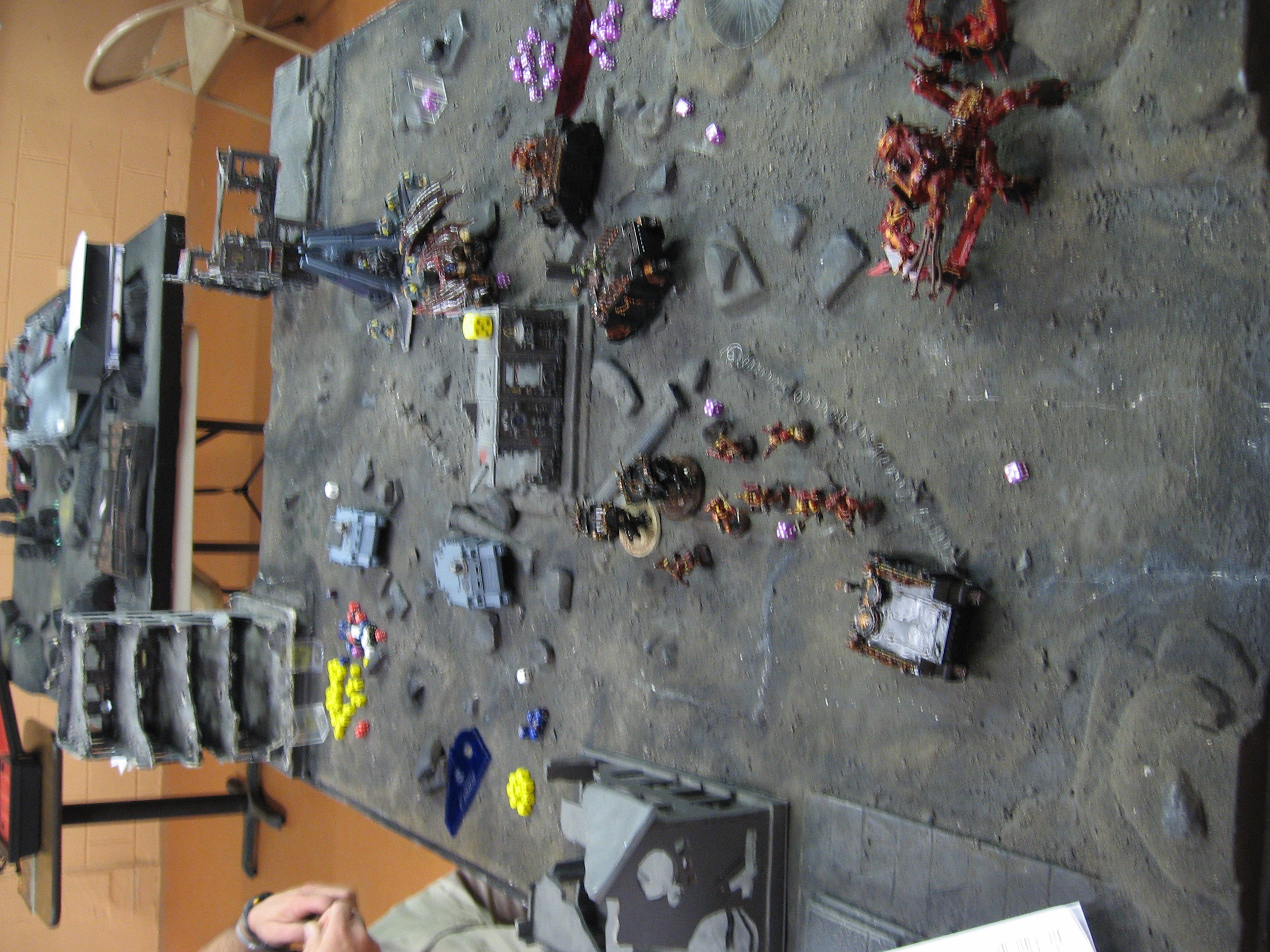 At this point, I am losing the game, and Keith has a scoring unit in my deployment zone. I need another turn to pull this off. I roll for it, and get a 4. We keep playing.