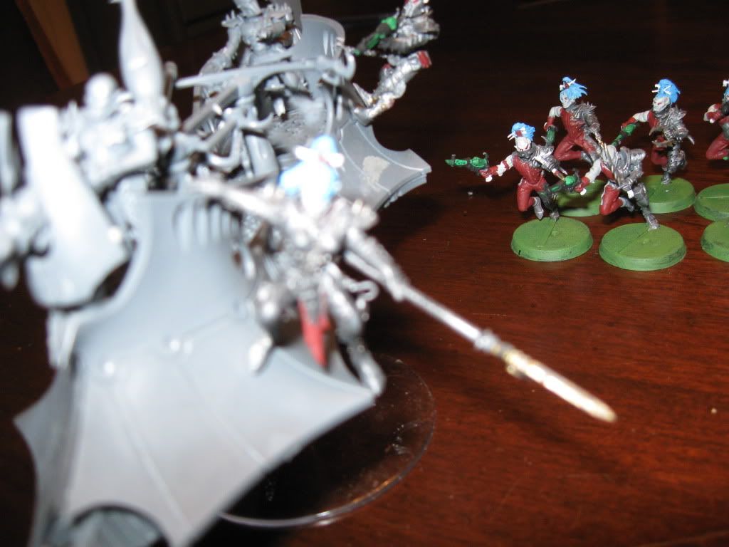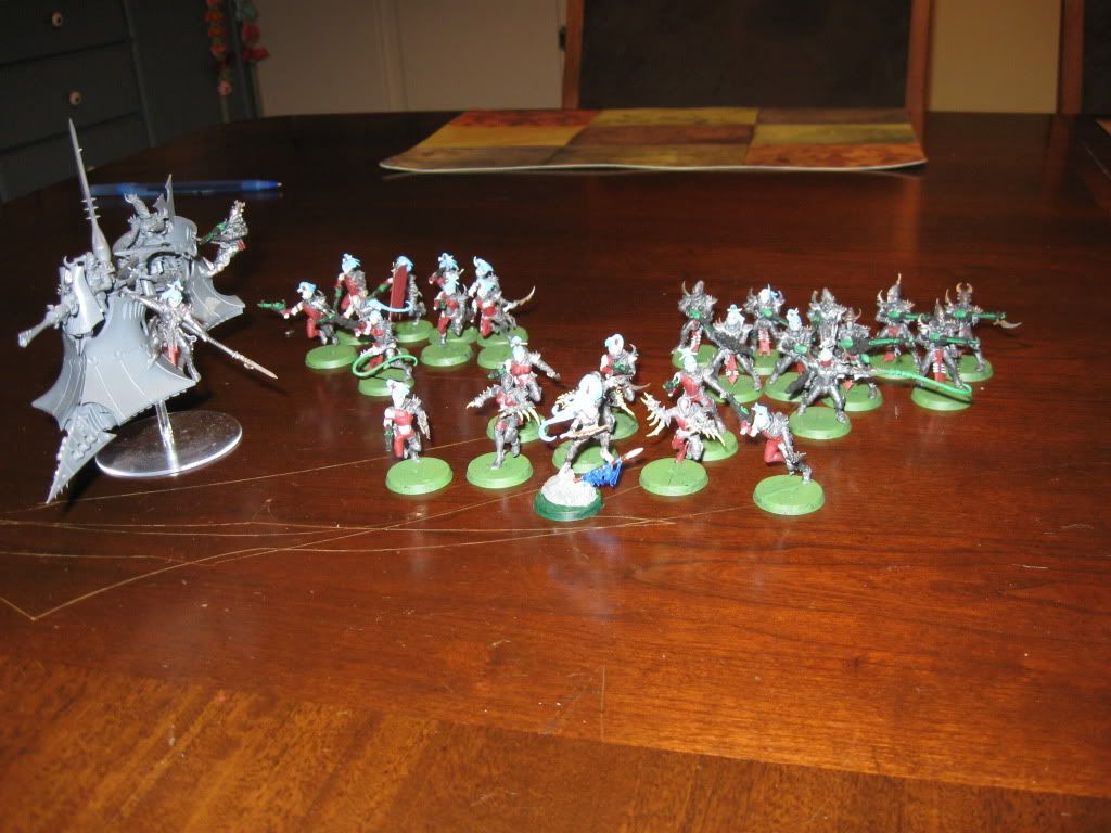 You're a machine at painting! You did all that in a week?! I am still working through my squad of wyches (i can only bring myself to batch a max of five). I don't know if you haven't painted your raider for the same reason as me: I have no idea how i'm gonna do it! I wish they were like guard tanks: Spray colour, Drybrush, drybrush and drybrush some more. Maybe add some sand to the bases? Take a handful from one of those massive sacks next time you're near a building site, It's what i did! 8-).