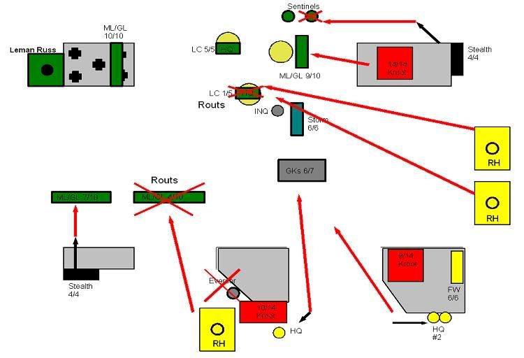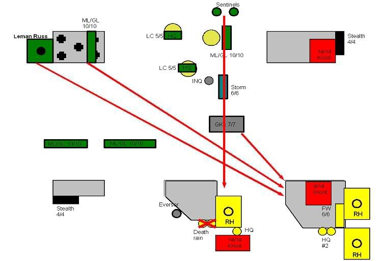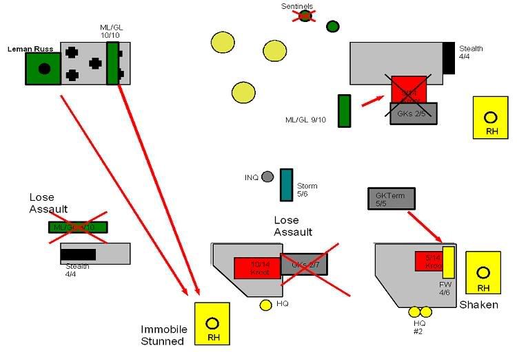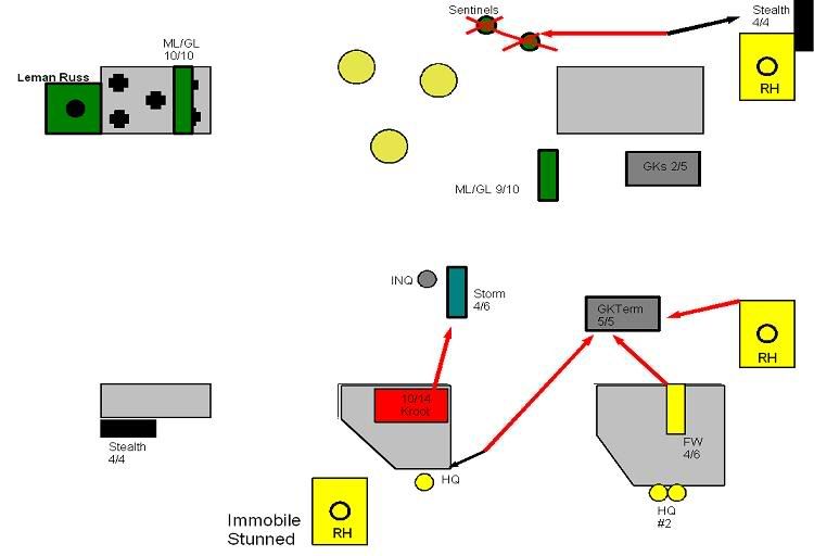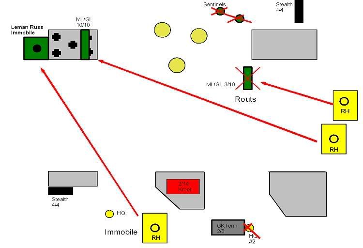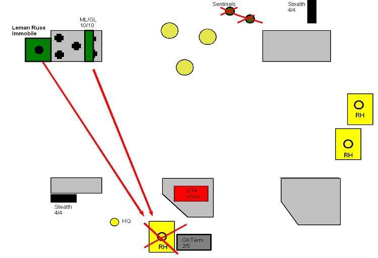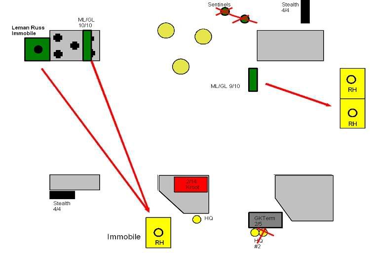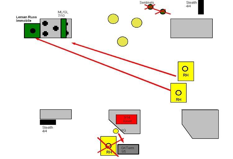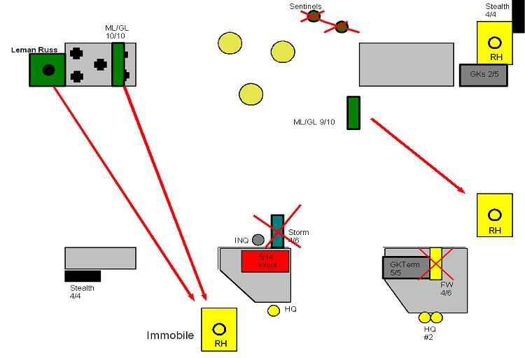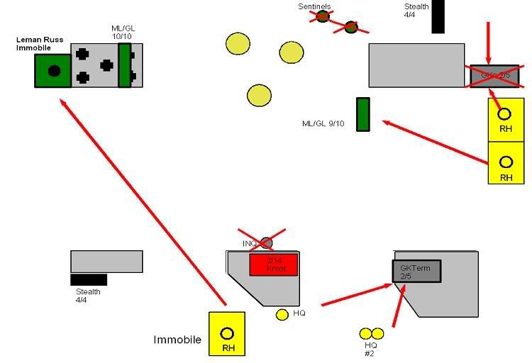The Hammerhead that been pounded the last few turns gets some measure of revenge with a glancing (cover) immobilization against the Leman Russ. The two HQ teams do some damage to the terminators, killing 3 off. Good, but not enough. The Hammerhead finishes off the remaining GKs after the stealths fail to kill either.