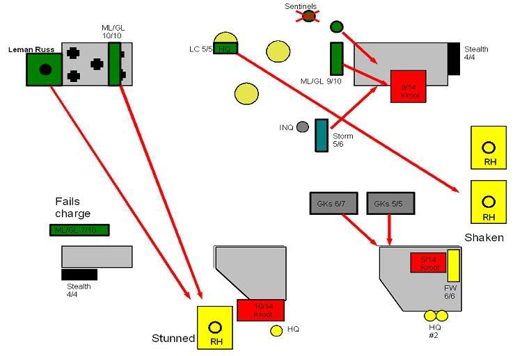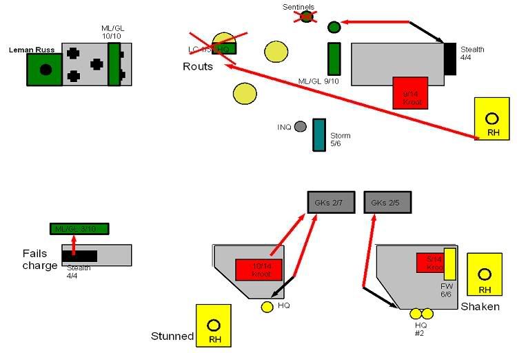 And, the inevitable happens, with the termies charging the poor FWs and cutting them down. GKs round the corner, but fail to see the stealths. The inquisitor and stormtroopers charge, and in the nasty fight that follows, all the storm troopers and 4 kroot die.