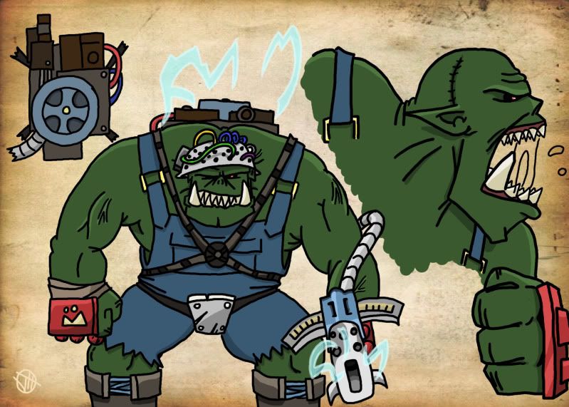 Hey Dakka, Many more moons ago, I had a brief art thread running and I catered to many of your requests. I have recently graduated college and have a fresh length of free time to spend painting Plague Marines, building Skaven, and drawing for Dakka. I noticed that after rearranging my Photobucket that most of the old links are broken but I can post all those old pictures again on request. I wanted to post this at night so I am not immediately assailed with the wails of the masses but feel free to bombard me with requests this time again, and I'll do what I can to smash my pen against the tablet until art comes out. In the meanwhile, please enjoy this Dark Heresy mini-boss I created for my players; Big Mek Nutkrusha with his Kustom Force Field and Snazzgun.