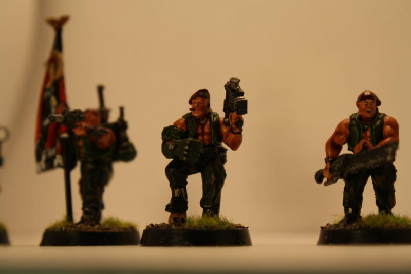 The kneeling legs and open hand arm are from the Catachan gun teams set, the head, body, bolter arm are from the Catachan command set. My Catachan colonel uses that absolutely awesome beret head: