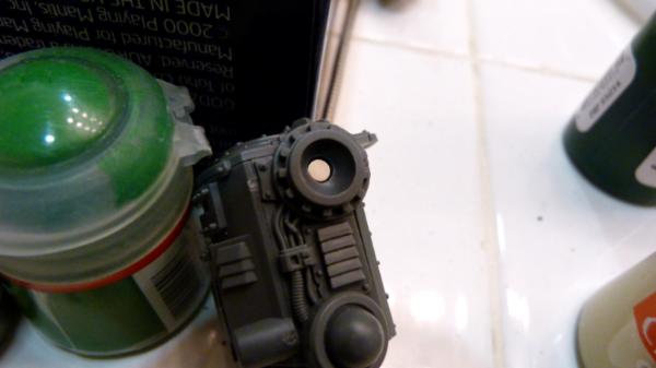 I decided to back the hole from the inside using green stuff. Second lesson: don't glue the whole kan together before you drill. Luckily there was still an opening where the engine will go, so I was able to get a glob of green stuff in there and mash it into place with a toothpick and the flat of a hobby knife. The pictures show the magnet sitting on the green stuff. When it dries, I'll glue it into place.