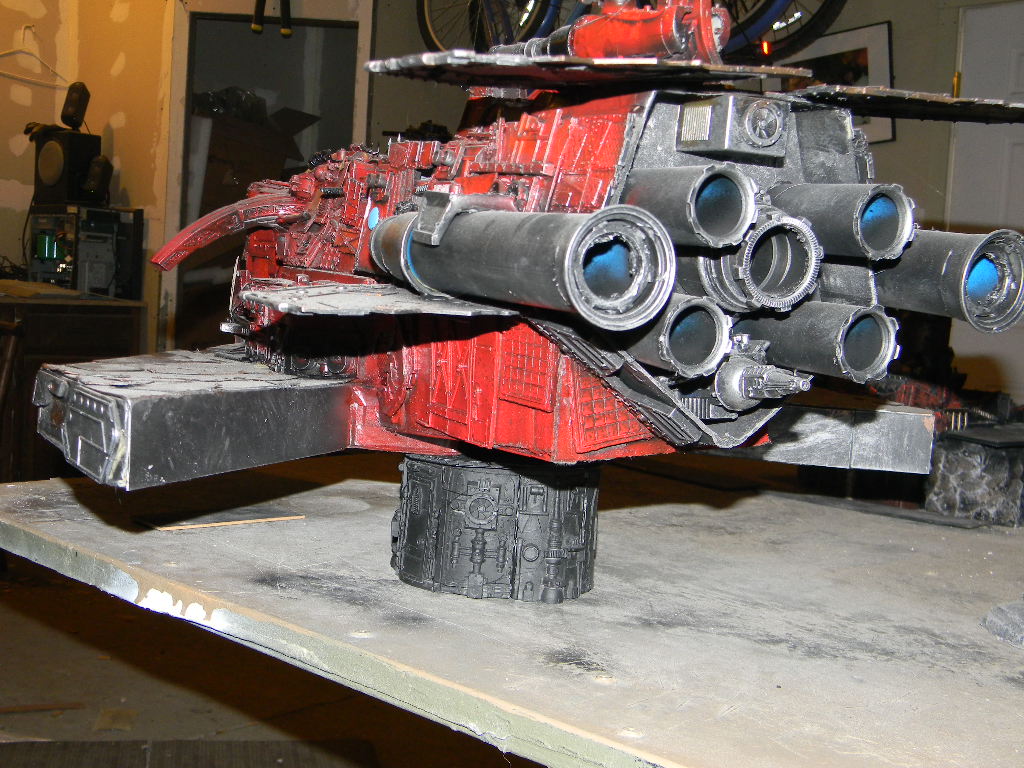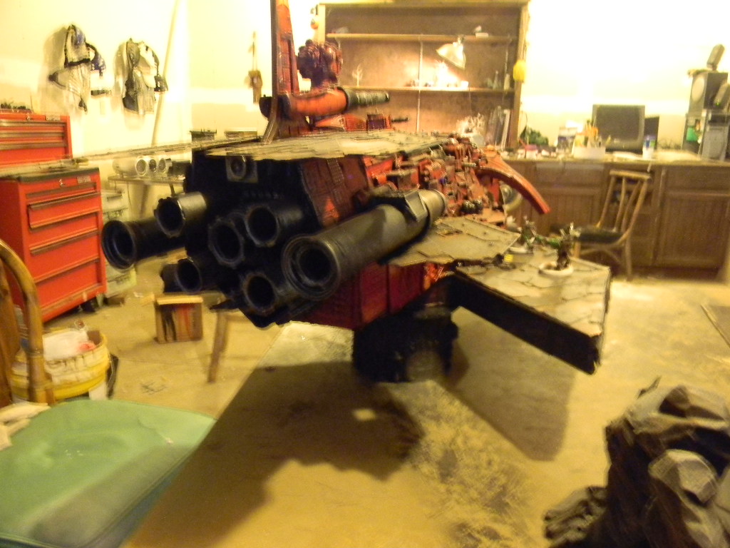I've almost finished this enormous ork star cruiser. Just tryin to get a few comments and see what you all thought about this 9 month project. This model is about 30 inches long, 22 inches wide, and 14 inches tall to the highest point. It has 6 battlewagon big shoota turrets, a killkannon, 2 deff kannons, gaze of mork, and a force field generator. They engine system consists of 7 main rokkit engines. I think it should at least hold 60 dudes or more, maybe a couple deff dreads too.