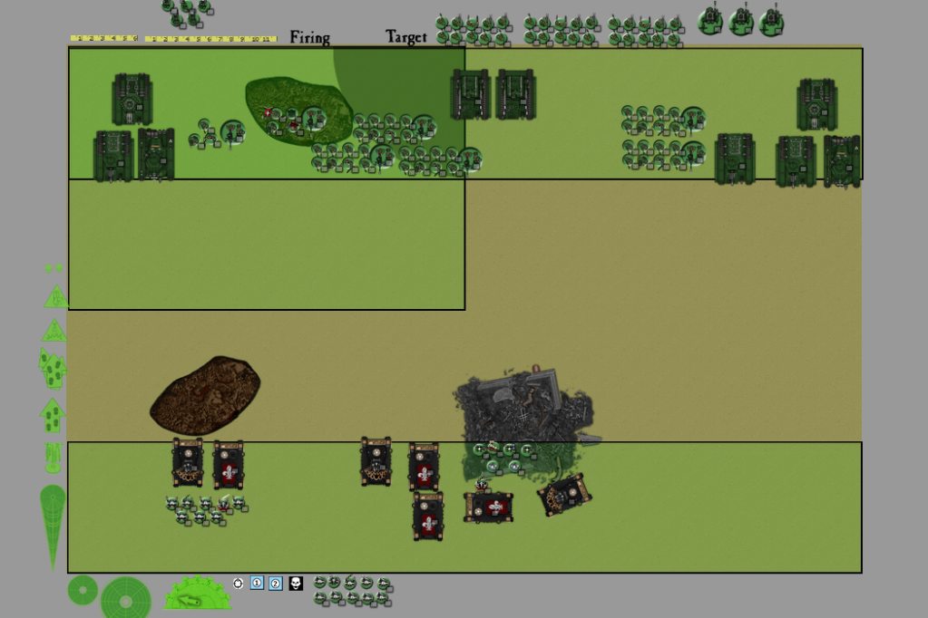 On the left flank, the Demolisher’s main gun roared to life. The gunner’s aim was off, however, and the shell veered sideways, barely missing its original target of Squad Nariko’s Rhino and instead exploding next to it, shredding one unlucky Seraphim in the blast. The Platoon Command Squad fired at Squad Nariko’s Rhino, but, like the rest of the Guardsmen, failed to damage the sturdy tank. A second later, however, the leftmost Chimera’s side hatches opened, and the Veterans inside fired their meltaguns at the Rhino. One shot sizzled through the tank’s armour and pierced its fuel stores, causing it to explode in a tremendous fireball. Two Sisters perished in the blast, and the remainder of the squad bailed out of the wreckage, charred but alive.