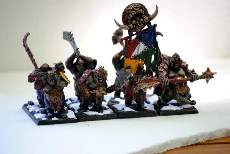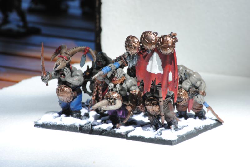 This was the first unit of bulls I built 6 years ago, and the last that I painted, because of how hard it was to find the right bit of bark to base the champion on. I found that the best ways to make one's ogres visually interesting are to a) use a bunch of different methods to paint the metal scaps b) have a few different colours for the pants c)paint the lips and teeth. Also, chardon granite + bleached bone makes the best skin mix.