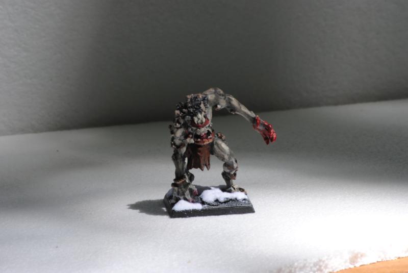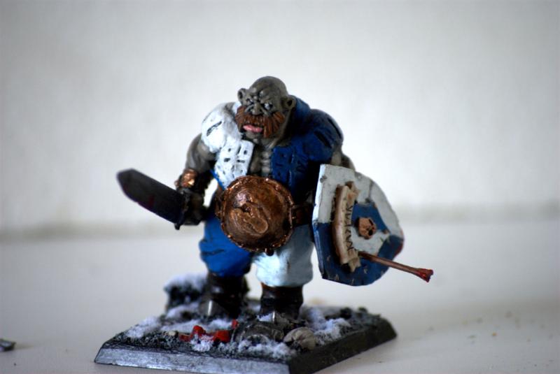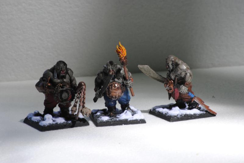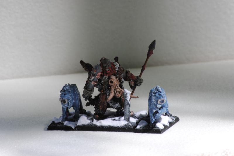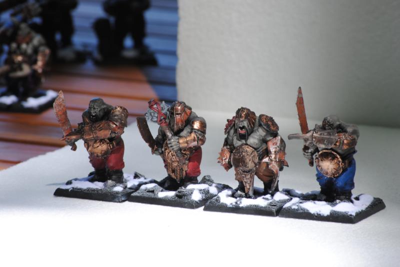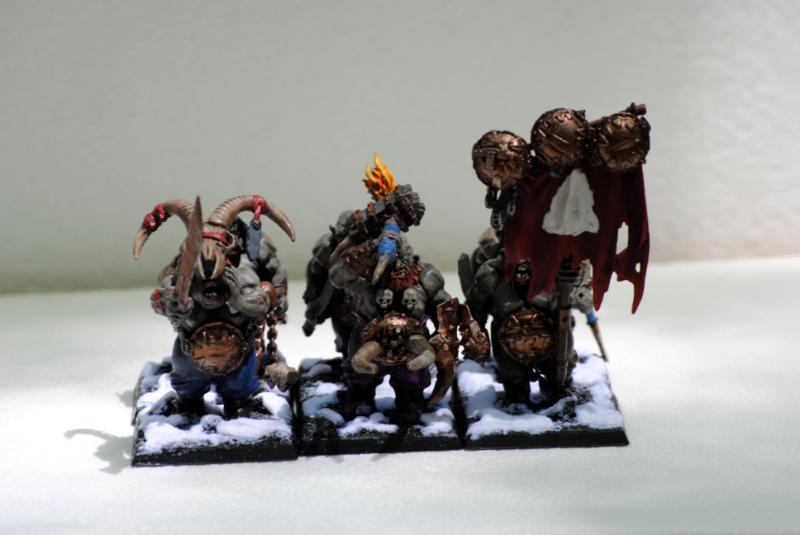 pretty rubbish standard, with lots of drybrushing. Near the end of last year, I converted up an ogre or two, just for funsies, and I realised that I was actually a pretty decent painter. So, given that the new fantasy edition came out not so long ago, and made ogres pretty effective, I decided to repaint and rebase everything. Rebasing was achieved by using a scalpel and cutting the sand off the base. Also, I learnt that making the pva/white paint/snow slurry is the only effective way of making snow properly. Anyhoos, here they all are:
