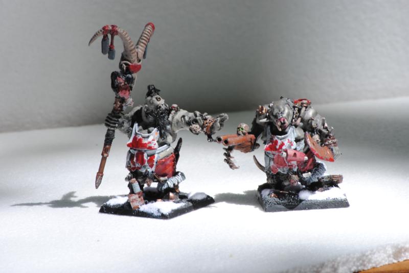So, my main force consists of two units of 8, one of them being just a unit of bulls. I converted these guys to be a bit more elite, what with all the armor and stuff from leftover ironguts bits. Unfortunately, the light was a bit iffy, so the photo isn't amazing. I'll probably have to wait until this afternoon before I can get something a bit better. I'm a bit miffed that you can't take heavy armor on bulls. It would be a bit of a waste, but I'd probably take it just for fluff. You also might have noticed by now that all the squad leaders have purple pants. I tried making a hierarchy of pants, but in the end, it ended up as all hierarchies do: 'These guys are at the top, and you guys aren't'