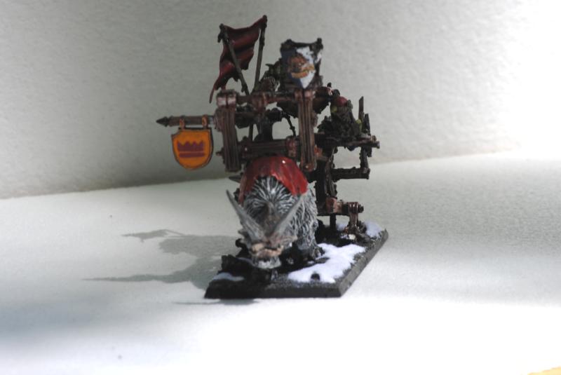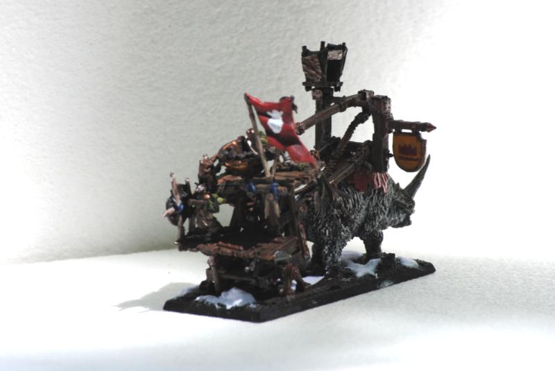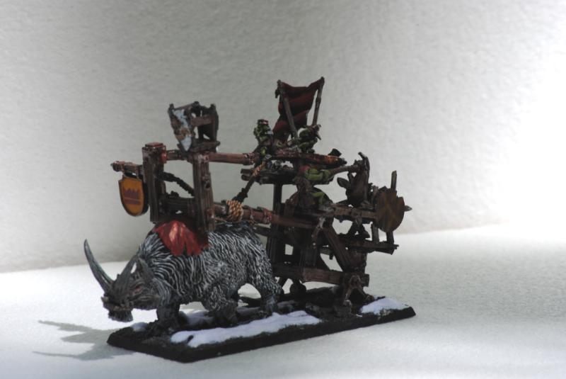 Then, there is the humble scaplauncher. This is quite possibly the most infuriating model ever. When I first assembled it, I didn't pin it, so it fell apart pretty much all the time. Seriously, if you are going to buy this, invest in a pin vice and a packet of paper clips. It's as solid as a rock now. Funnily enough, depite being a pile of wood and rusted metal, I actually had a lot of fun painting this. Although, if it weren't for foundations and washes, I probably would have lost my mind. I also discovered a great way to paint gnoblars. Snot green with a green wash. It's different enough from orcs and goblins, but it's still green enough to add a bit of colour to one's models. Also, I went a reposed the rhinox's head. I don't know why all the animal models seem to be so interested in the ground. I've also found that purple is a really effective wash when painting red.