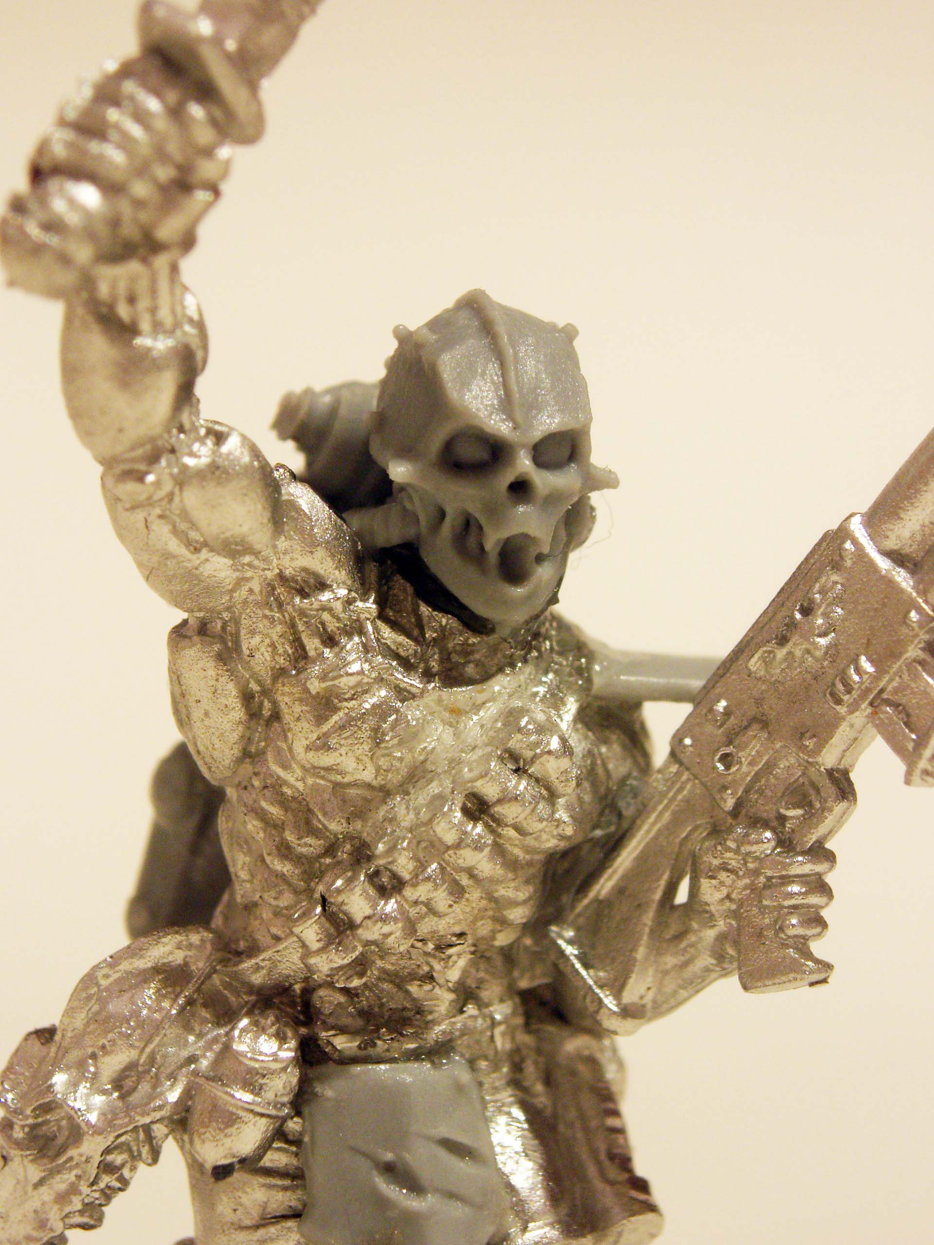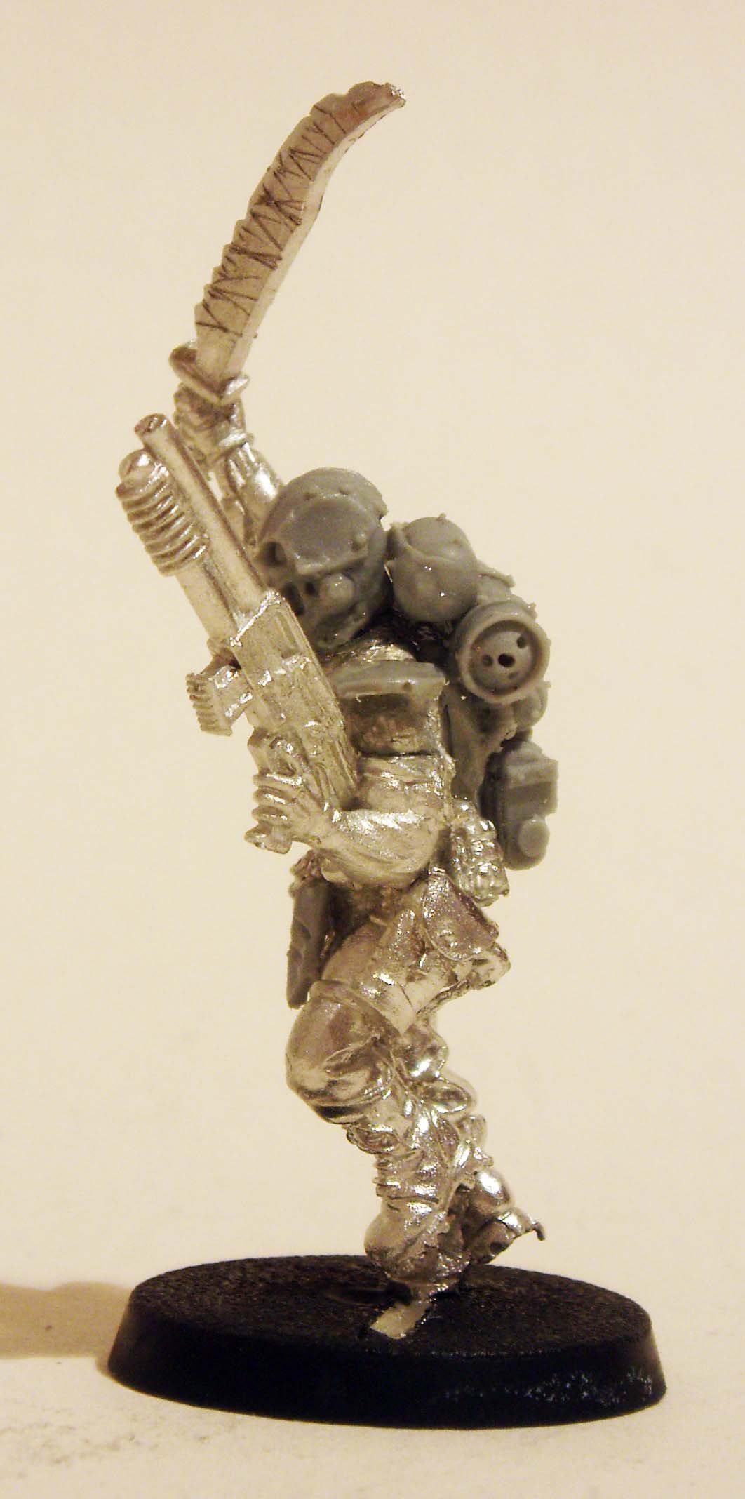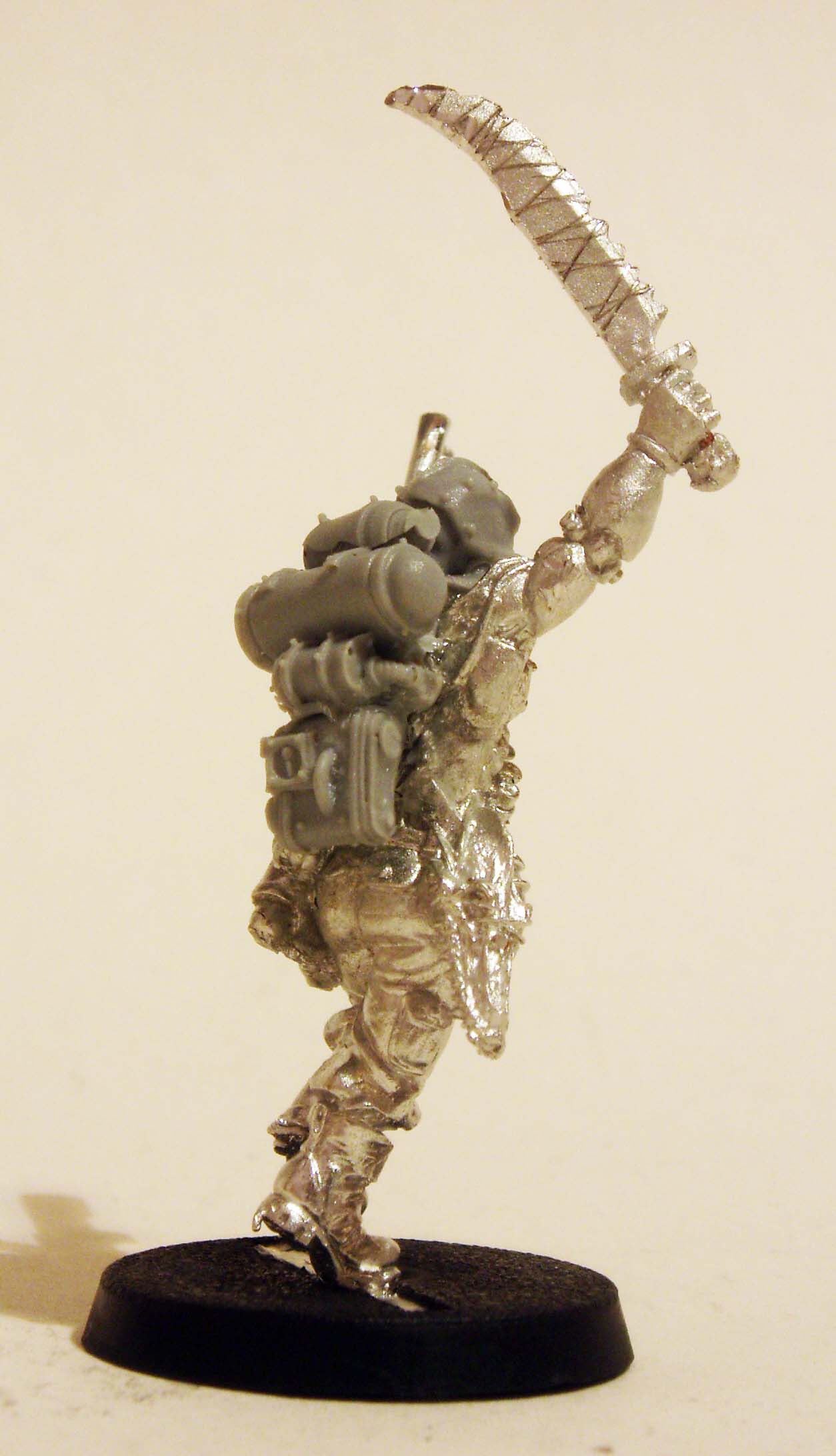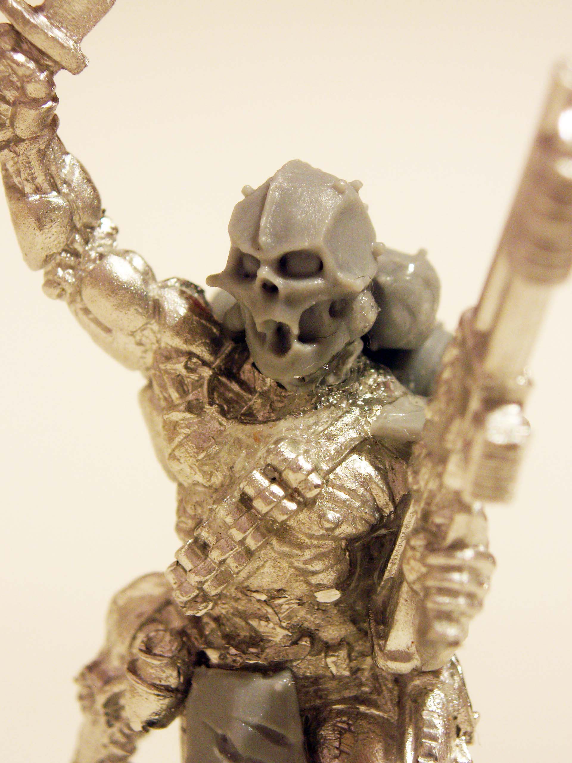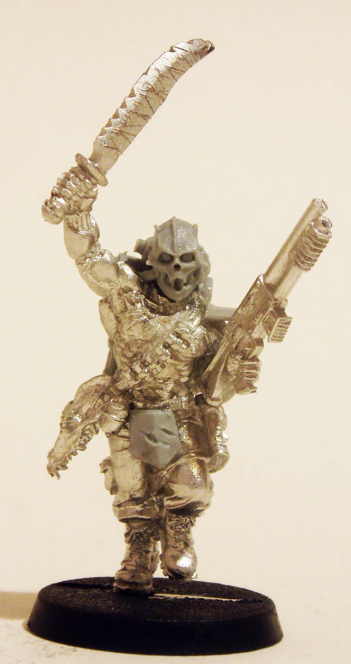 Love it, Love everything about it! Good play on words for the name, the mask is killer where is it from? Also the notched up sword is a nice touch. Cant wait to see this painted.