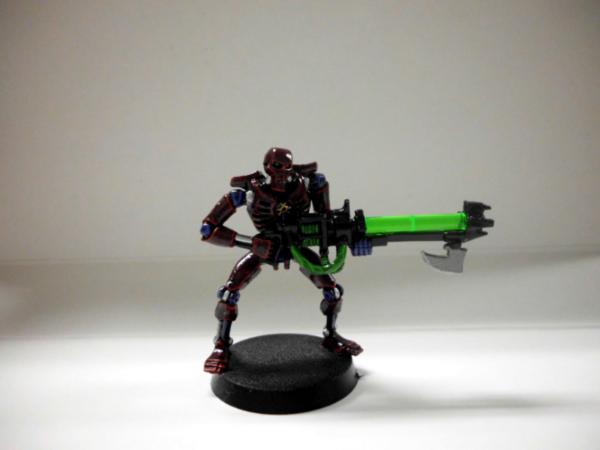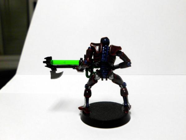 its the lighting, its real hard to get good lighting when your deployed to Iraq. but if you have the painters eye, its scab red, highlighted with blood red, then a light Laviathan Purple wash. the blues are Regal blue, highlighted with Ultramarines Blue, and the green portions are snot green, highlighted with scorpion green, with the Thraka Green wash thrown on top. i know that doesnt help much, but im going to try and get some pics of it with better lighting so you guys can see all the details. i spent the better part of an 8 hour shift on this guy and im pretty dissapointed how the pics came out, they do the model NO justice.