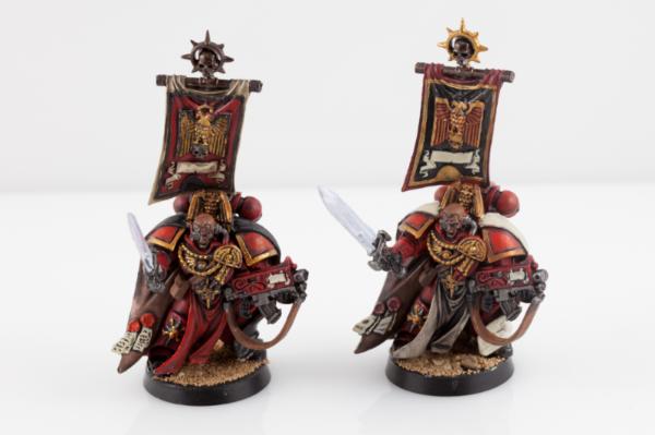 Finished up these two Captains next. I had basecoated them around the time I did my tactical squad, and had slowly been progressing on them when waiting for my other units to dry etc. Having duplicates of them from the two sets, I wanted to differentiate them from each other with diferent schemes. Still not confident enough to attempt a decent face, or power sword for that matter, so those items await my improving beyond 'noob' level. (found some wonderful tutorials on here for power weapons, will likely make an attempt tomorrow... I cant decide which one of these guys I want to ruin with my first effort